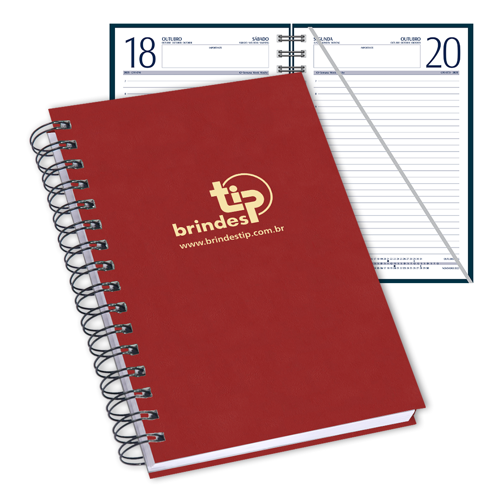 Agenda diária com planejamento no início de cada mês, tabelas úteis, índice telefônico, fitilho marcador de páginas e índice removível.