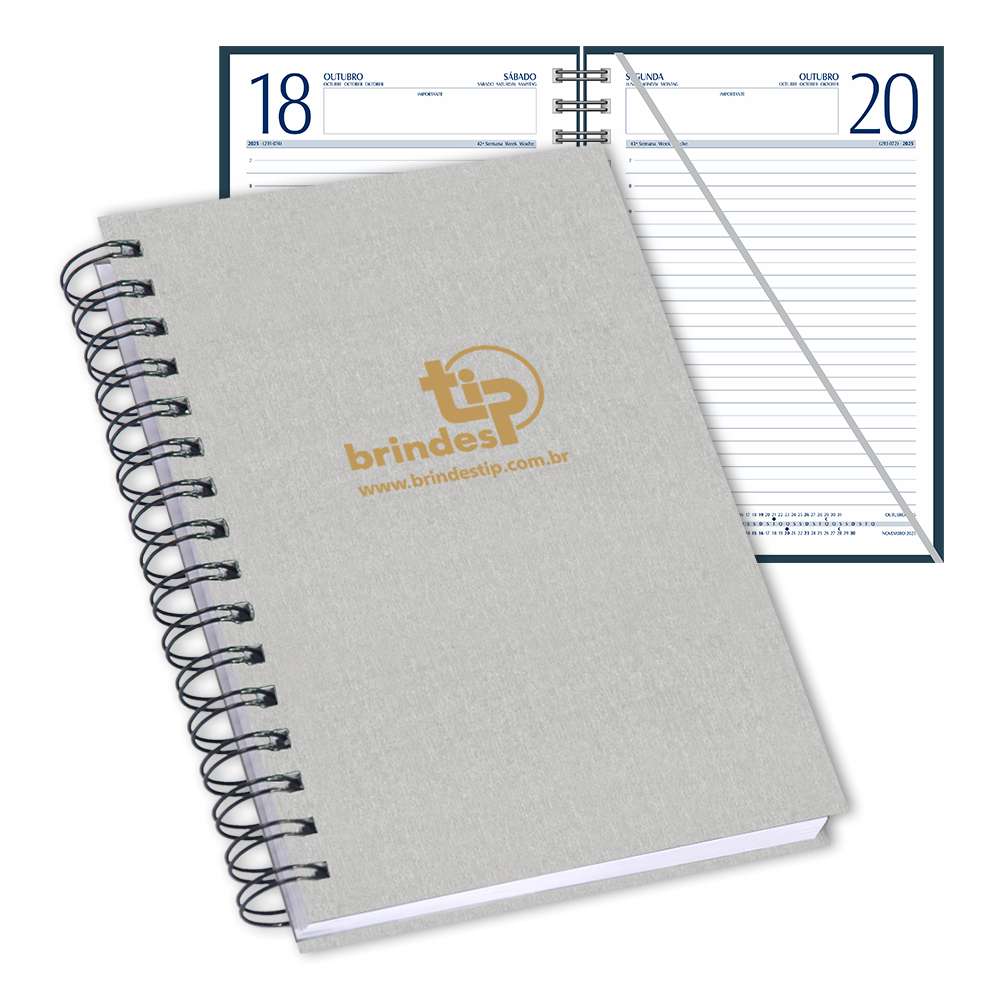 Agenda diária com planejamento no início de cada mês, tabelas úteis, índice telefônico, fitilho marcador de páginas e índice removível.