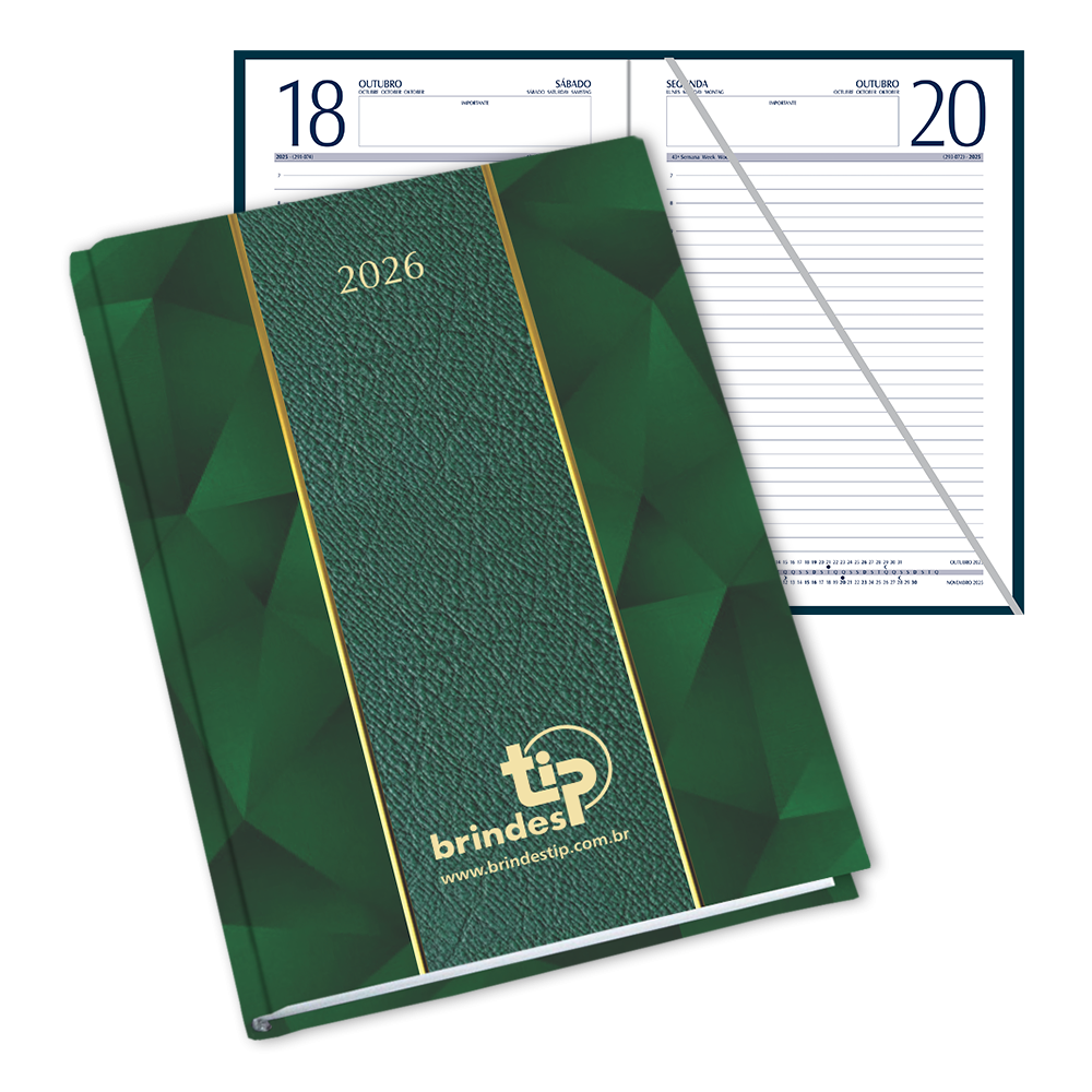 Agenda diária com planejamento no início de cada mês, tabelas úteis, índice telefônico, fitilho marcador de páginas e índice removível.