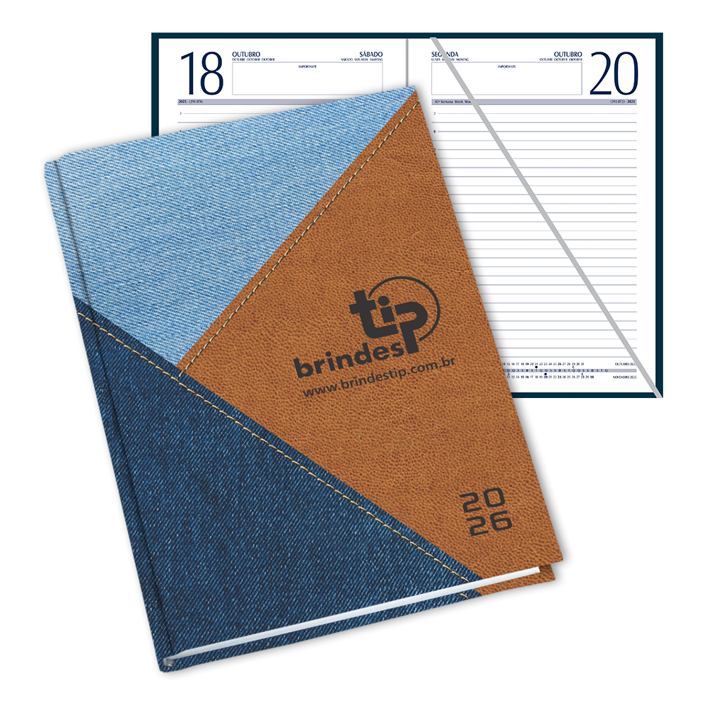 Agenda diária com planejamento no início de cada mês, tabelas úteis, índice telefônico, fitilho marcador de páginas e índice removível.