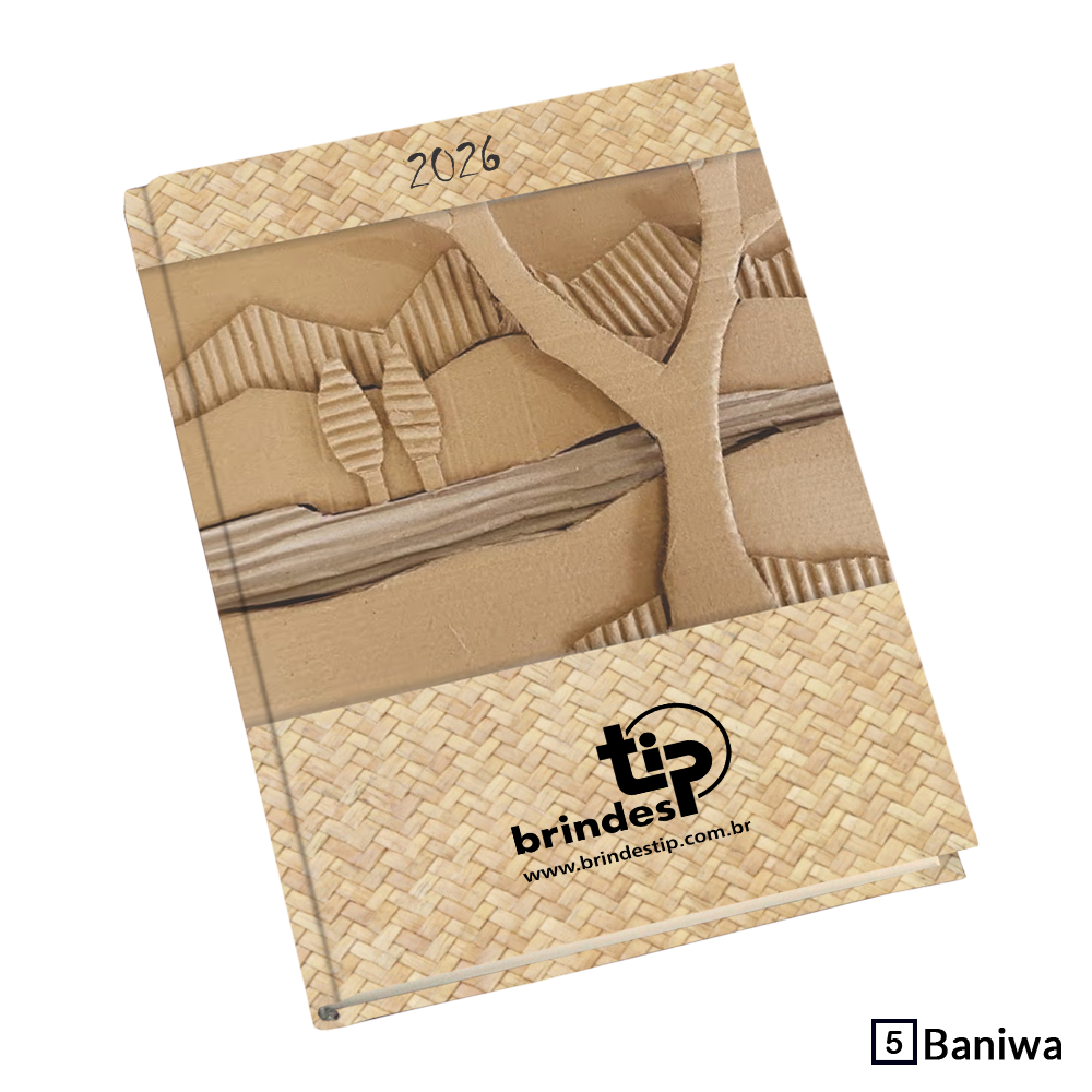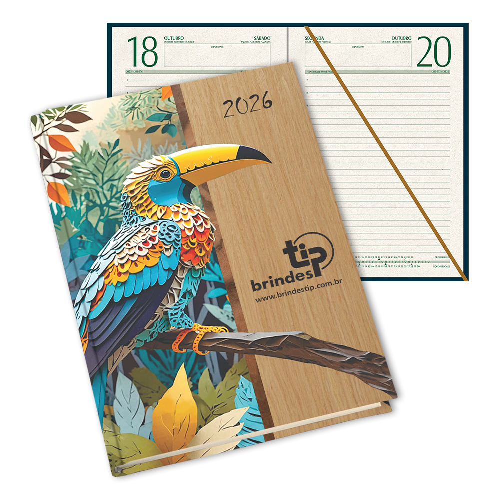 Agenda diária com planejamento no início de cada mês, tabelas úteis, índice telefônico, fitilho marcador de páginas e índice removível.