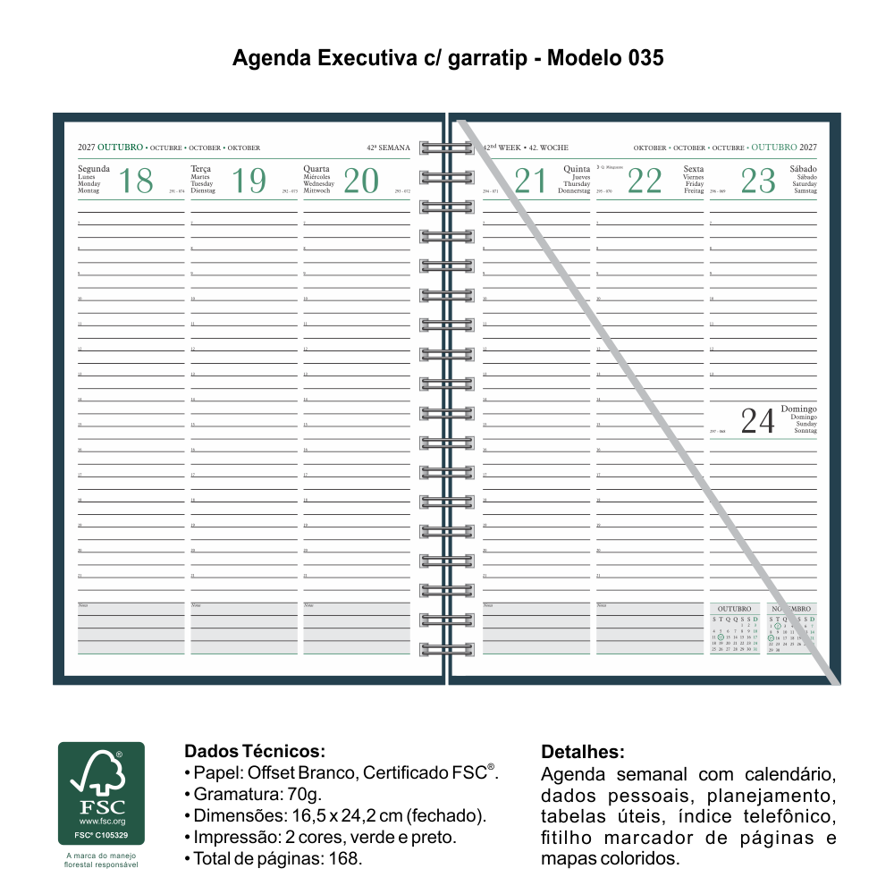 Opcionais: Apliques, cantoneiras, costura artesanal, fecho elástico, suporte para caneta, caneta, caneta personalizada, lupa para leitura, envelope transparente e régua marcadora de 15 cm.