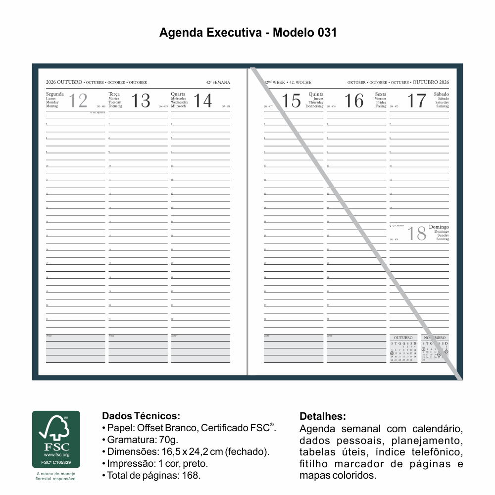 Opcionais: Apliques, cantoneiras, costura artesanal, fecho elástico, suporte para caneta, caneta, caneta personalizada e lupa para leitura.
