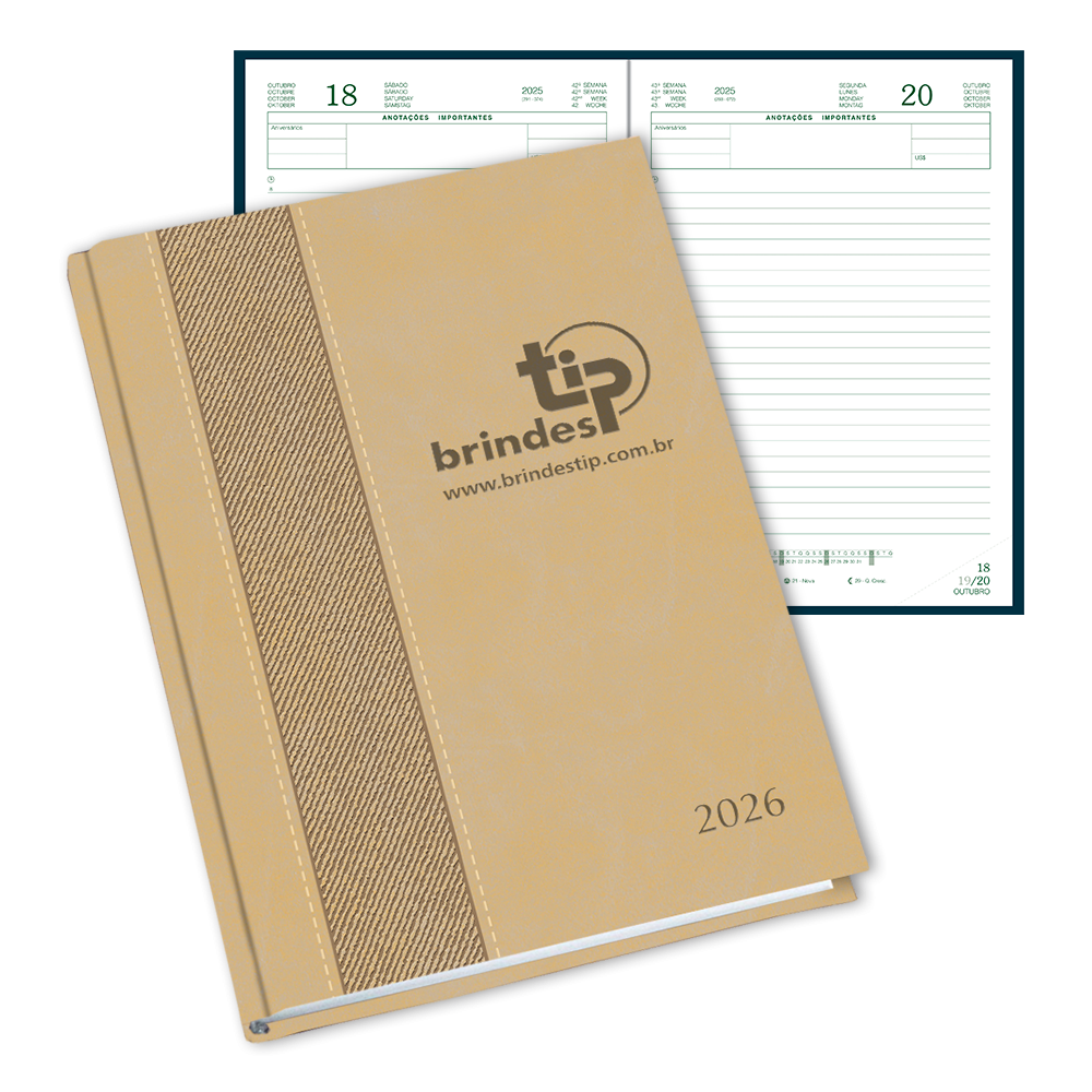 Agenda diária com picote lateral, tabelas úteis, índice telefônico e mapas coloridos. Fitilho marcador de páginas é opcional. Confeccionada somente na versão encadernada.