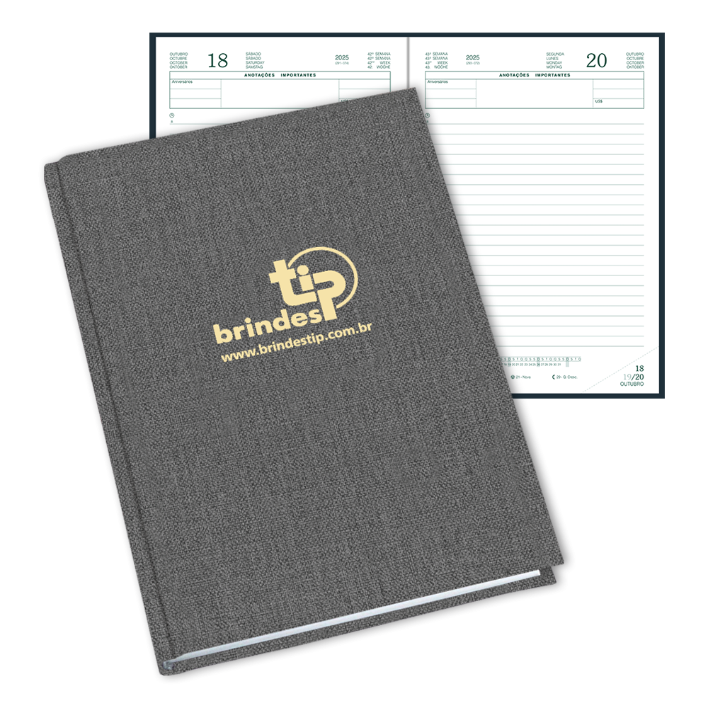 Agenda diária com picote lateral, tabelas úteis, índice telefônico e mapas coloridos. Fitilho marcador de páginas é opcional. Confeccionada somente na versão encadernada.