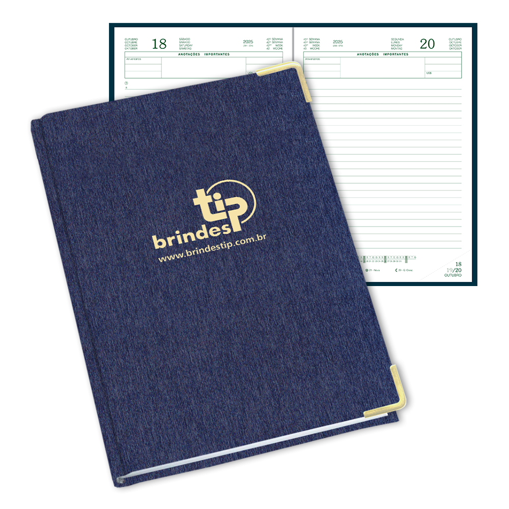 Agenda diária com picote lateral, tabelas úteis, índice telefônico e mapas coloridos. Fitilho marcador de páginas é opcional. Confeccionada somente na versão encadernada.