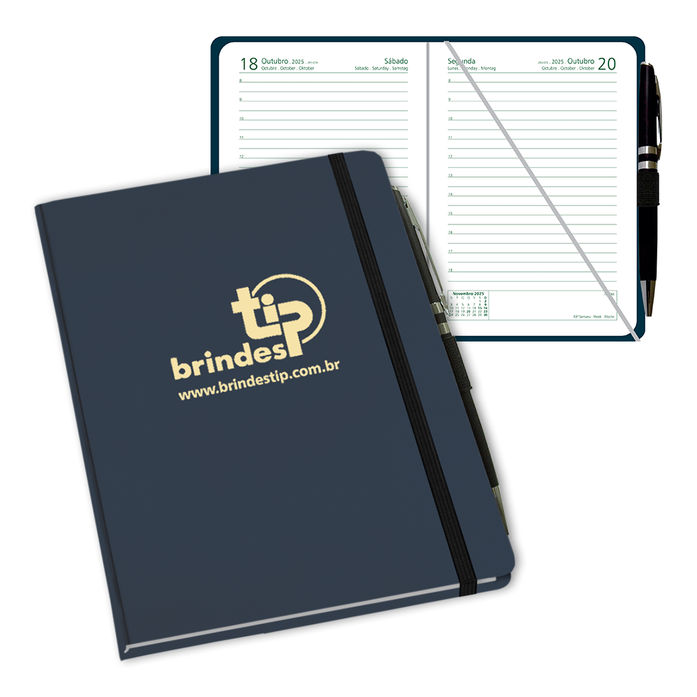 Agenda Prime SV - Sevilha. Material sintético, fitilho marcador de páginas, fecho elástico, cantos redondos, suporte para caneta com caneta inclusa e acabamento encadernado.