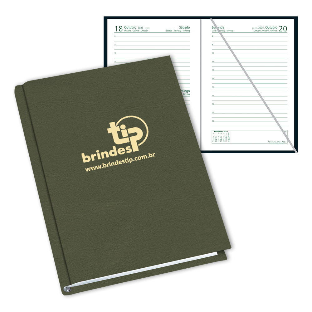 Opcionais: Apliques, cantoneiras, costura artesanal, fecho elástico, suporte para caneta, caneta, caneta personalizada e lupa para leitura.