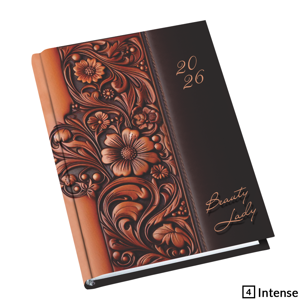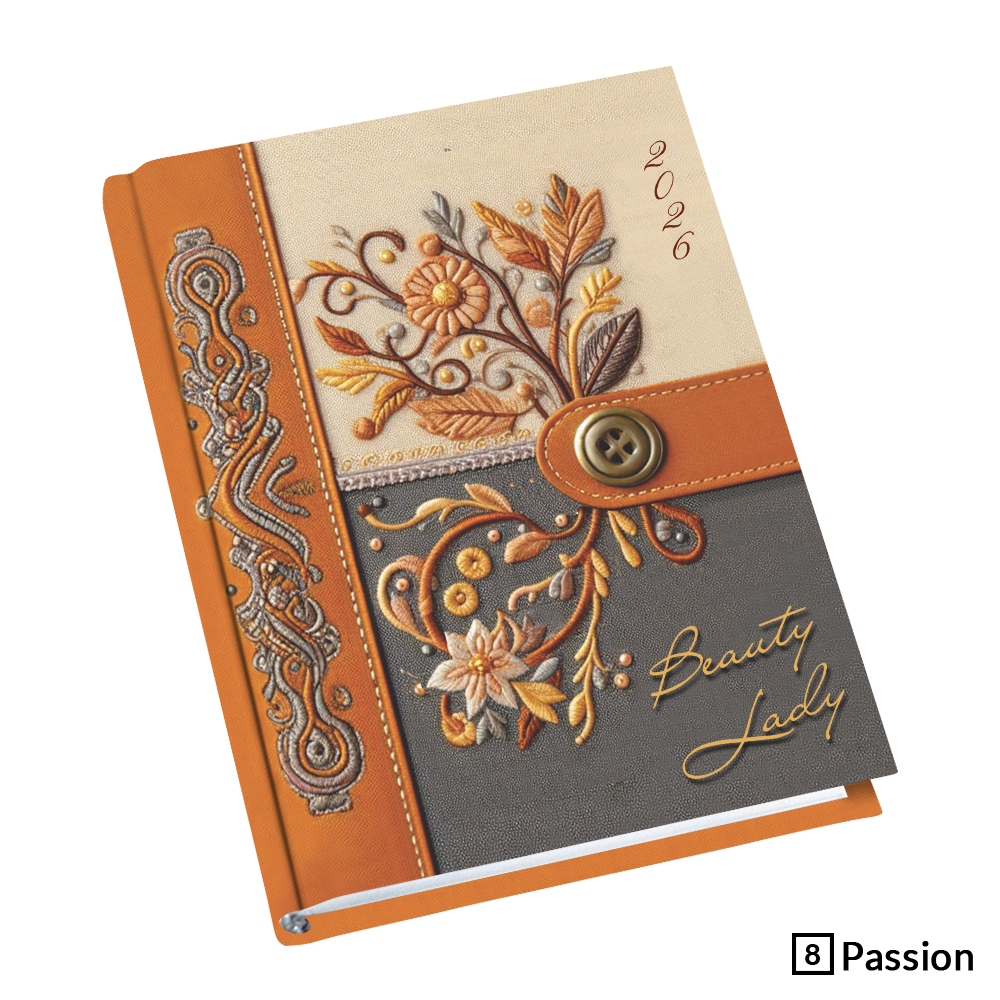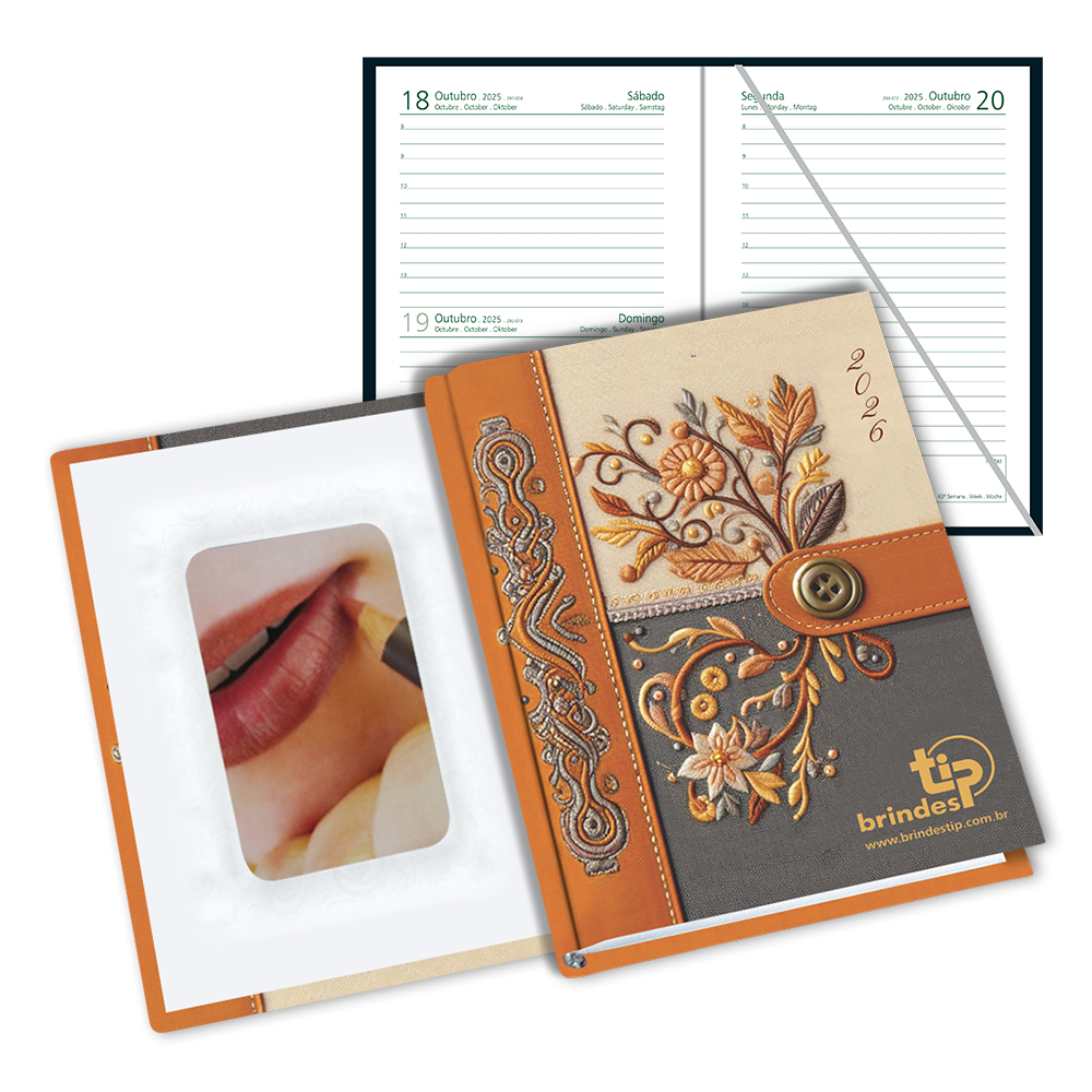 Agenda IF - Impressa Feminina c/ Espelho. Material impresso com arte temática, laminação brilhante, fitilho marcador de páginas e acabamento encadernado.