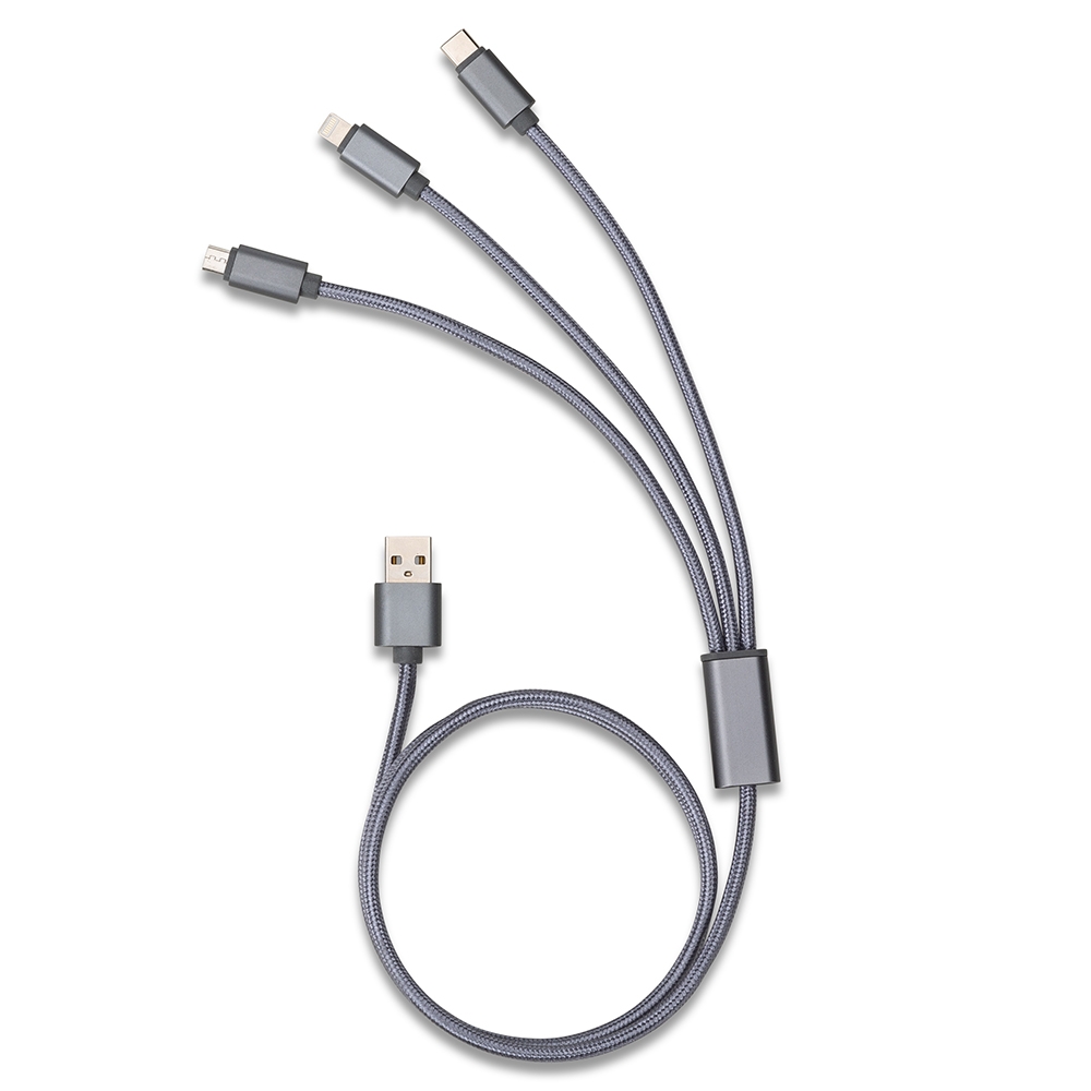 Cabo de dados 3 em 1 com revestimento em nylon, possui as entradas: USB Type-C (versão recente de Android), Lightning (Iphone) e V8 (Android).