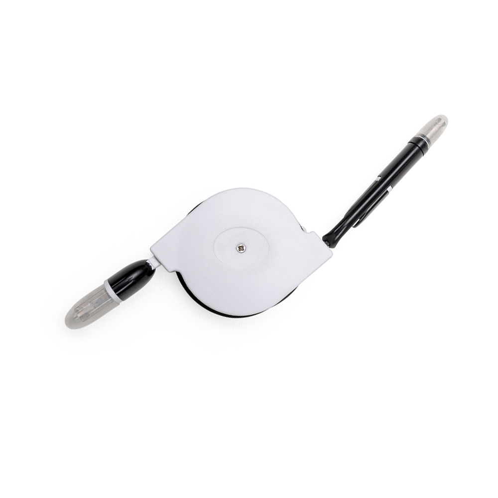 Cabo de dados retrátil 3 em 1. possui entradas: V8/Android, Lightning/Iphone e USB Type-C/novos Androids. A saída V8 é a mesma saída para o Lightning, cada lado da peça carrega um tipo de aparelho, basta inverter a posição ao encaixar. Além de recarregar, também transfere dados. Suporte plástico branco de frente lisa e verso com detalhe oval (com parafuso no centro). Possui rolamento com trava automática, os dois lados de cabo devem ser puxados simultaneamente e ao soltar irão travar. Não puxar um cabo por vez para não embolar.
