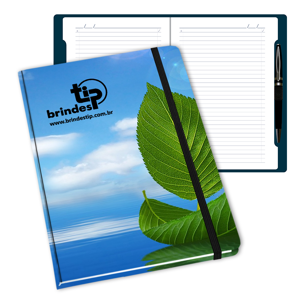 Caderno Prime BI - Laminada Impressa. Material impresso com a arte do cliente, fitilho marcador de páginas, recorte, cantos arredondados, suporte para caneta, caneta, fecho elástico, acabamento encadernado e laminação acetinada ou brilhante.