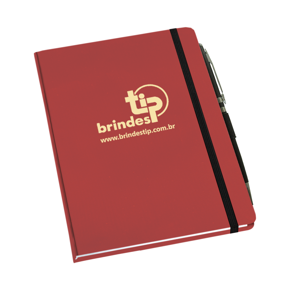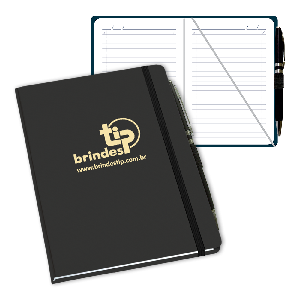 Caderno SV - Sevilha. Material sintético, fecho elástico, cantos redondos, suporte para caneta com caneta inclusa e acabamento encadernado.