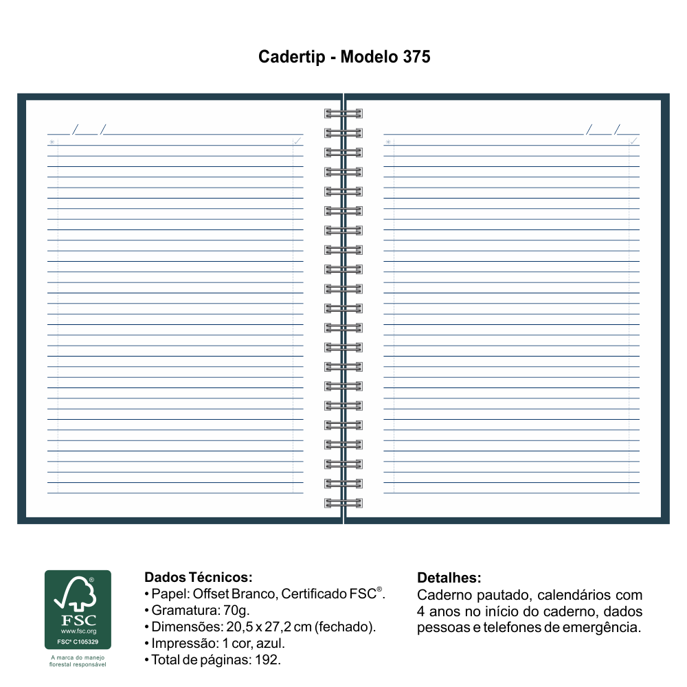 Caderno pautado, calendários com 4 anos no início do caderno, dados pessoas e telefones de emergência.