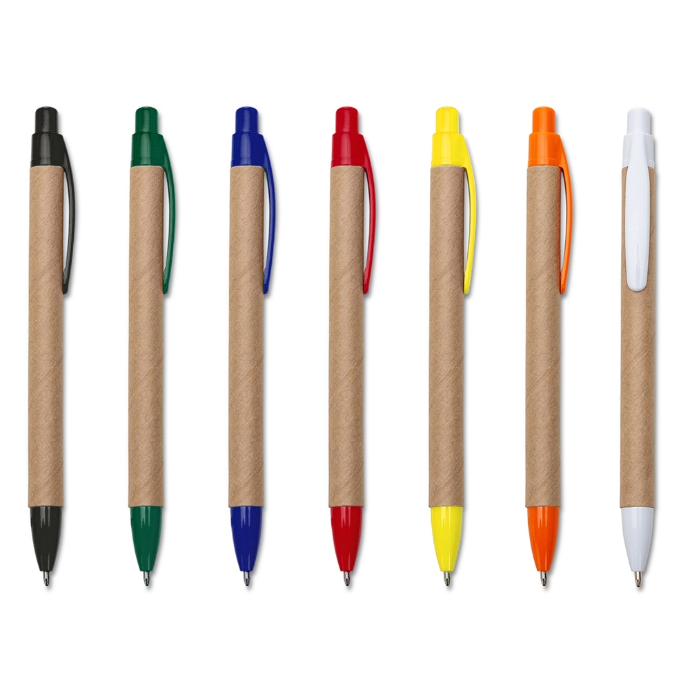 Caneta ecológica de papelão com detalhes coloridos, o clip pode facilmente ser retirado para personalização no corpo da caneta. Clip e ponteira plástica, aciona por clique.
