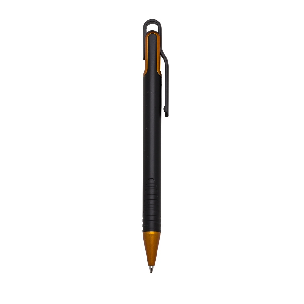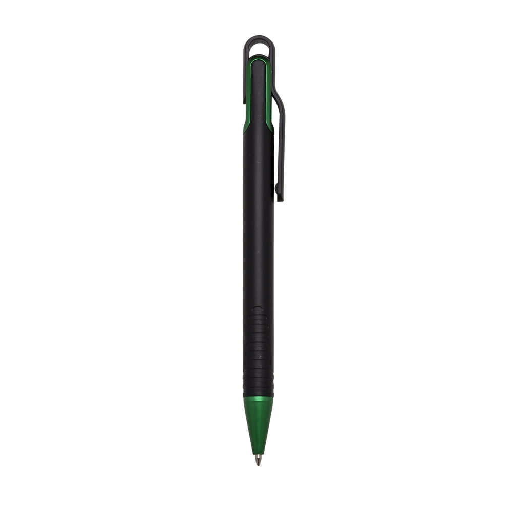 Caneta plástica inteira preta com laterais do acionador colorido. Detalhes em relevo na parte inferior. Aciona por giro.