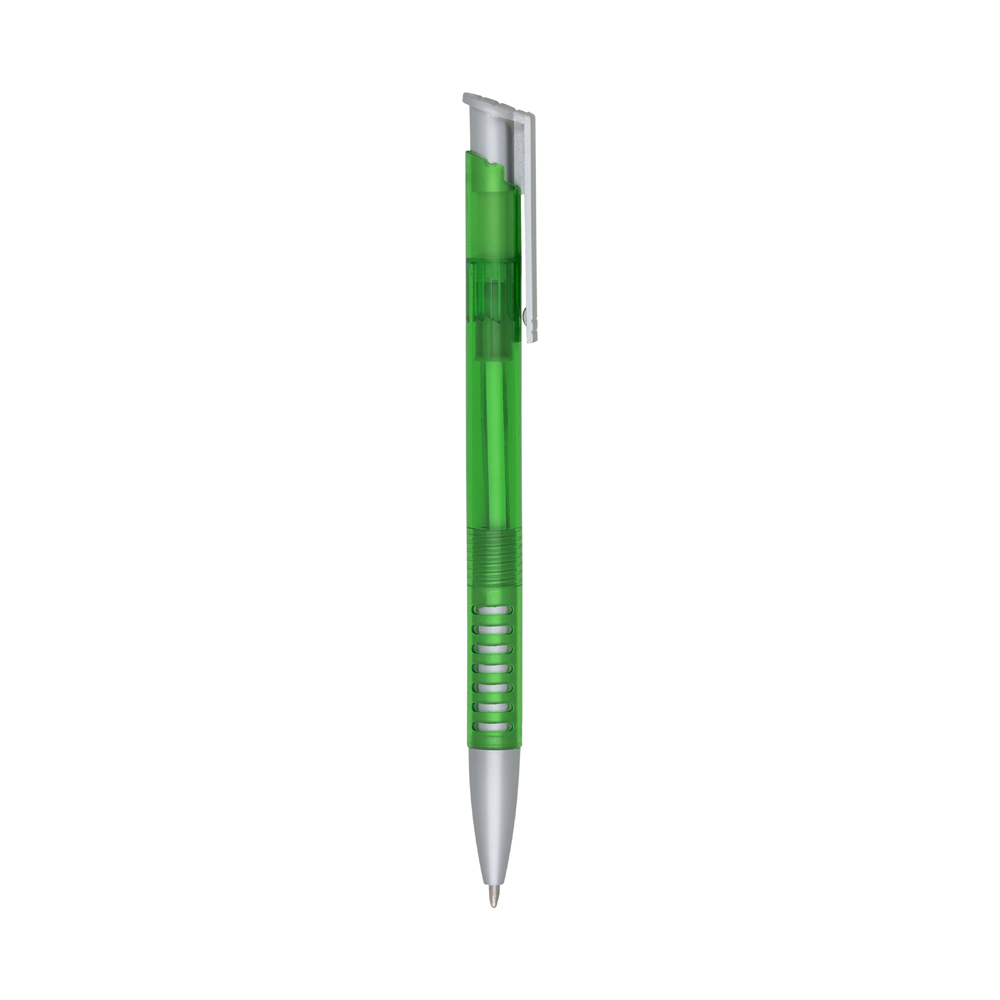 Caneta plástica prata com detalhes coloridos translúcidos. Clip plástico prata e parte inferior com sete linhas prata. Aciona por clique.