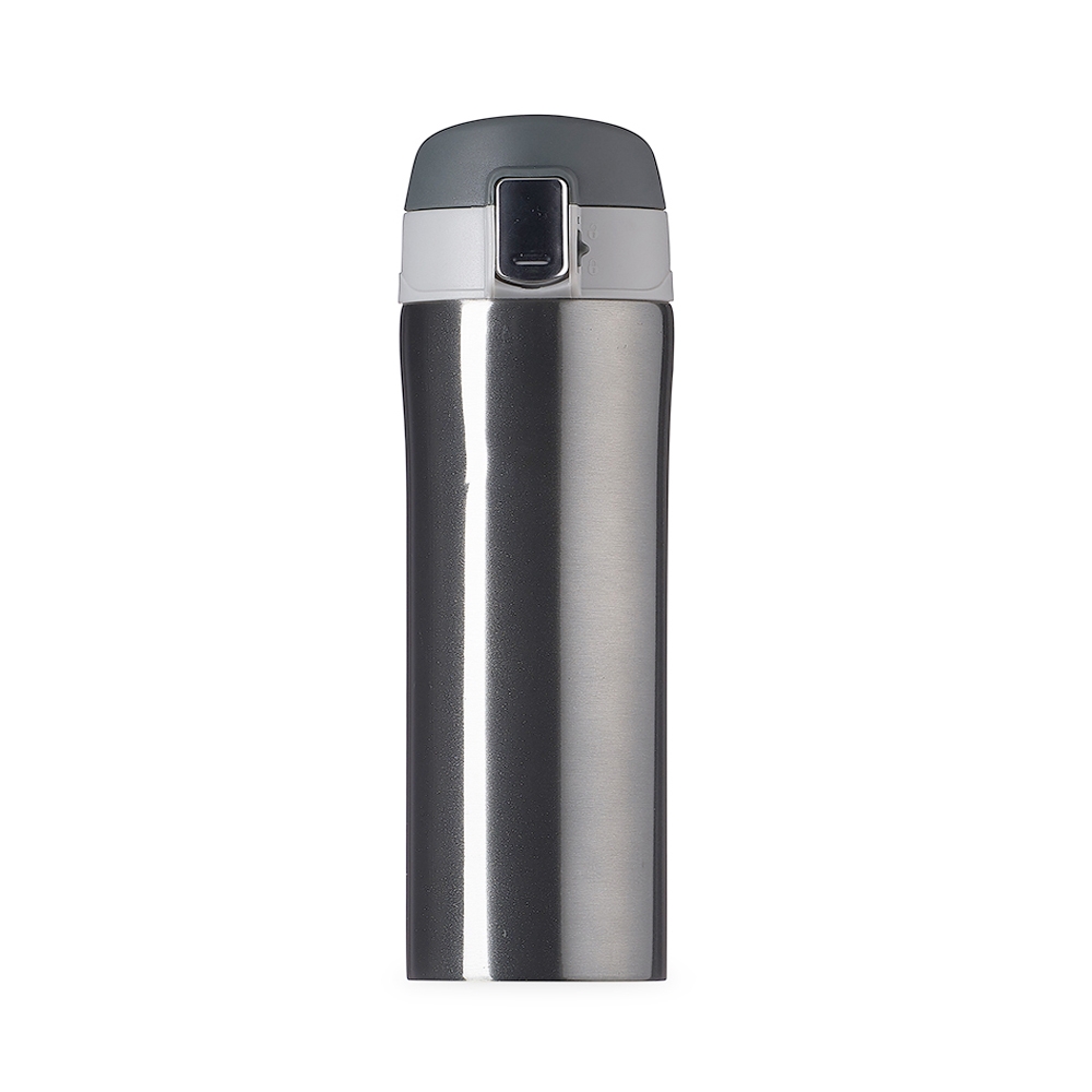 Garrafa térmica 350ml colorida com sistema de trava. Material metálico com revestimento interno em inox, possui tampa plástica fosca com borracha interna para vedação evitando o vazamento de líquido e prezando sua temperatura; possui botão central para abertura e trava lateral(basta seguir a orientação dos desenhos de cadeados simulando o travamento/destravamento da tampa).