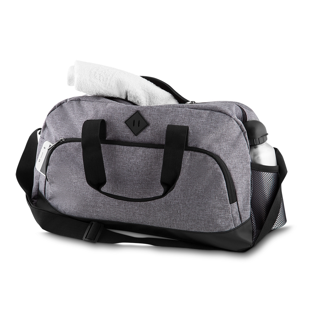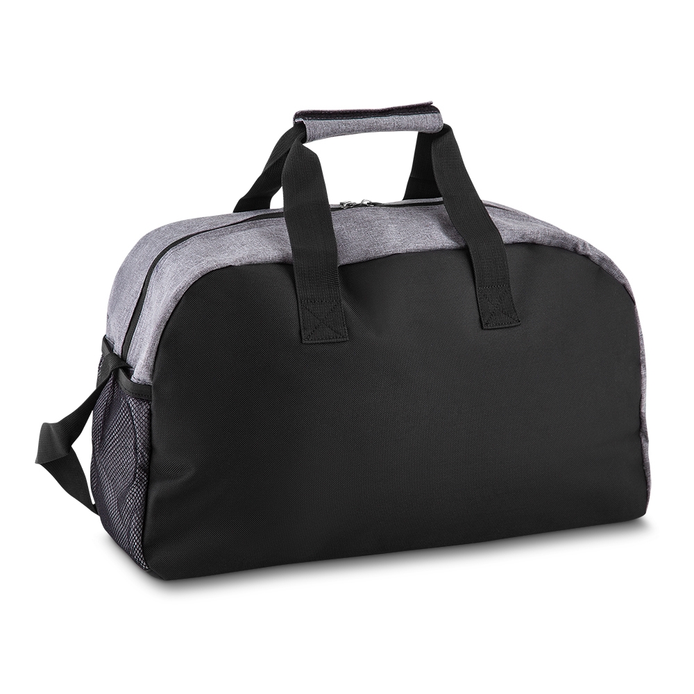 Mala esportiva de poliéster. Possui bolso frontal, bolso lateral de malha e bolso grande superior. Alça de mão com pegador cinza de velcro e alça transversal ajustável.