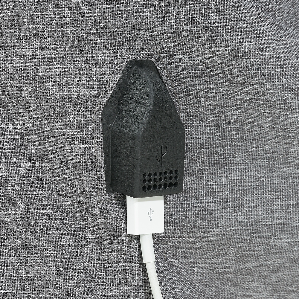 Mochila anti-furto de poliéster com detalhes em nylon. Com formato anatômico e design moderno, tem a parte frontal à prova d’água e tecido impermeável. Pensando na segurança do usuário foi confeccionado o compartimento principal na área traseira, impossibilitando a abertura do produto mesmo com a mochila na costa do usuário. Possui suporte com entrada USB na parte externa e cabo USB acoplado internamente; permitindo a conexão de um carregador portátil na área interna e a conexão de um eletrônico na área externa, viabilizando a carga e utilização do eletrônico enquanto caminha. Área interna do compartimento principal: bolso para notebook 14 polegadas, quatro bolsos para acessórios, bolso com zíper; possui nas laterais internas sistema de velcro, maximizando a segurança da mochila. Alças para costa ajustáveis sendo uma delas com bolso de zíper, alça para mãos, alça horizontal para encaixe em malas de viagem, alças de costa e parte traseira revestidas com espuma para um maior conforto. Acompanha plaquinha para personalização.
