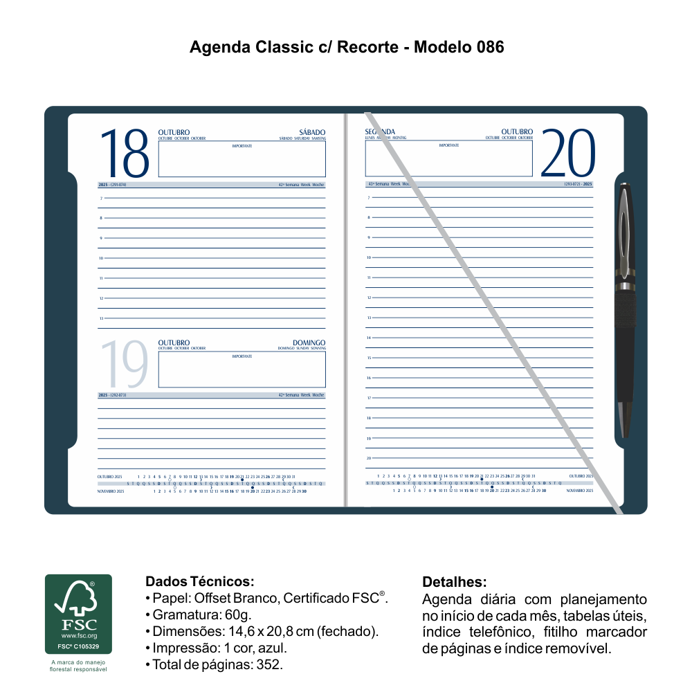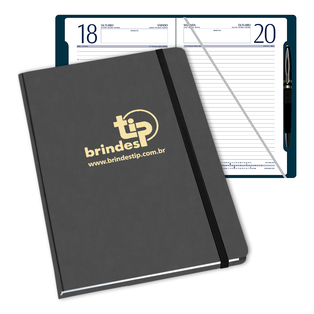 Agenda diária com planejamento no início de cada mês, tabelas úteis, índice telefônico, fitilho marcador de páginas e índice removível.