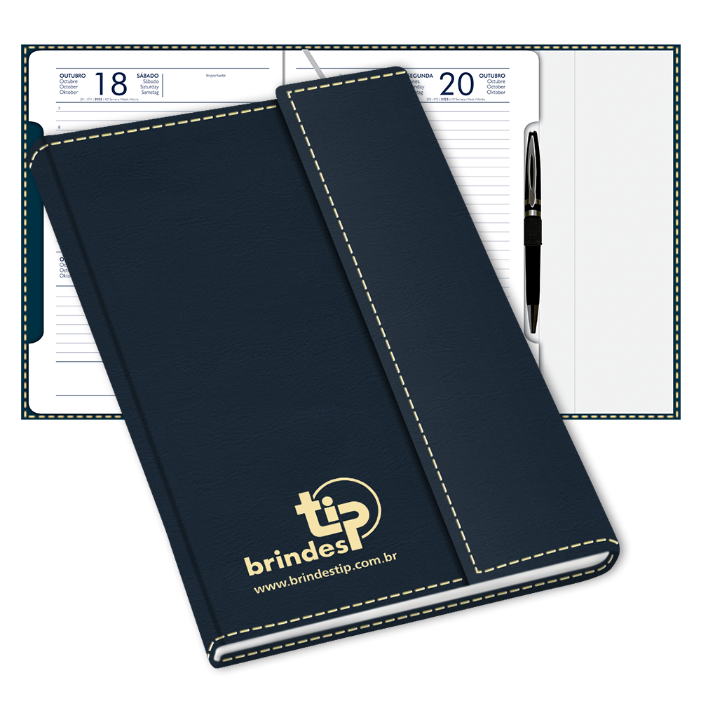 Agenda Prime AD - Andorra. Material sintético reforçado com aba magnética, costura artesanal, fitilho marcador de páginas, suporte para caneta com caneta inclusa e acabamento encadernado.