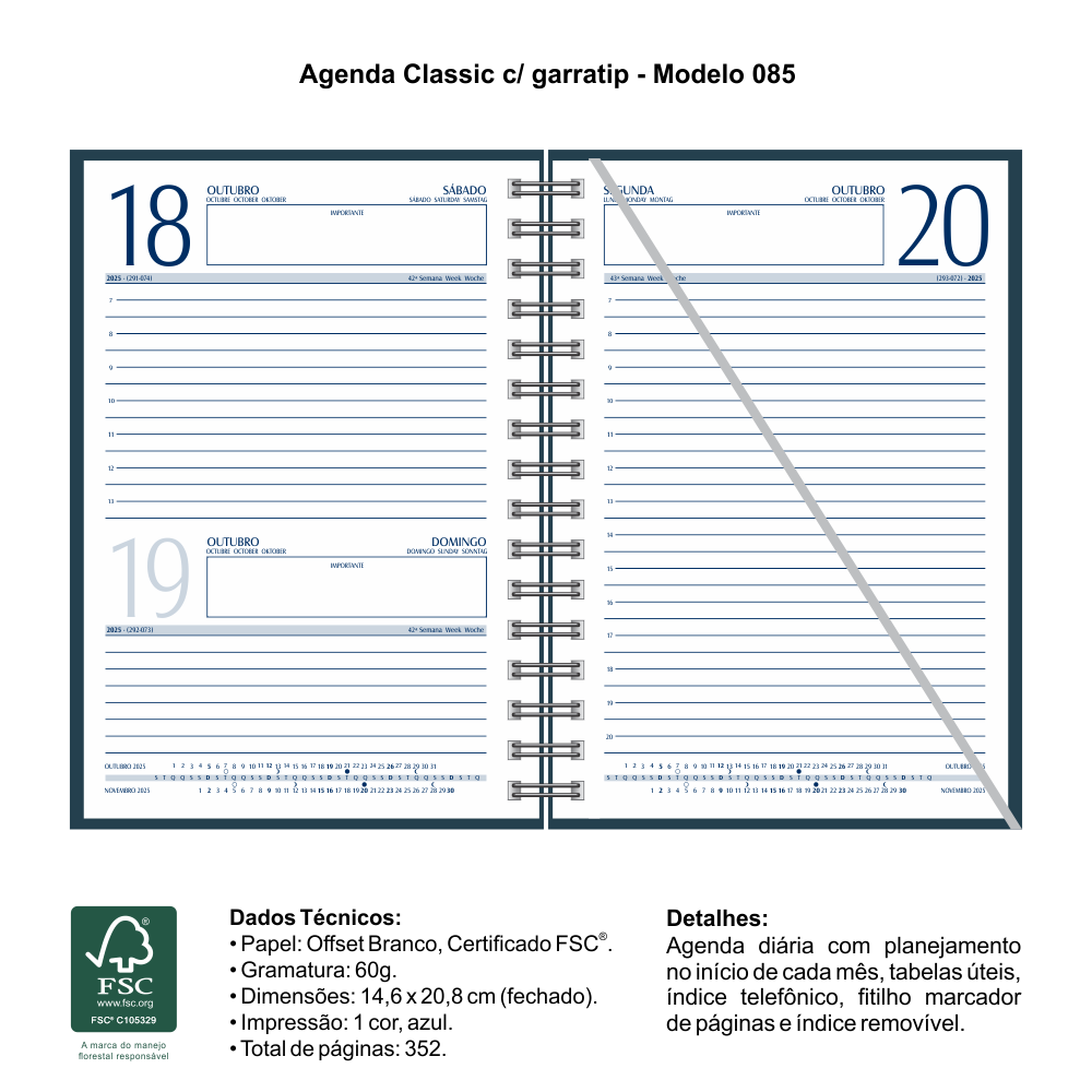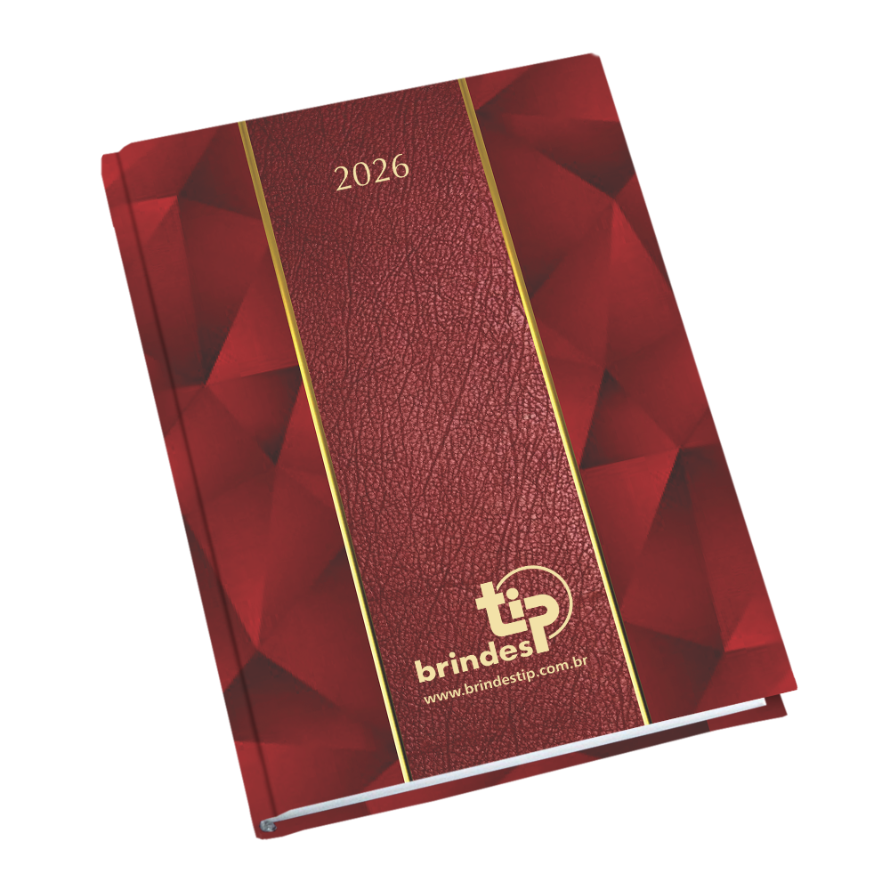 Agenda diária com picote lateral, tabelas úteis, índice telefônico e mapas coloridos. Fitilho marcador de páginas é opcional. Confeccionada somente na versão encadernada.