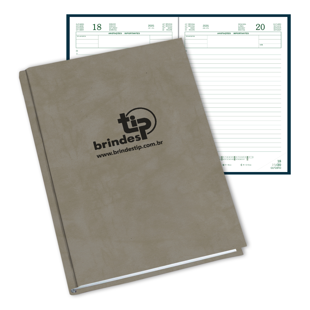 Agenda diária com picote lateral, tabelas úteis, índice telefônico e mapas coloridos. Fitilho marcador de páginas é opcional. Confeccionada somente na versão encadernada.