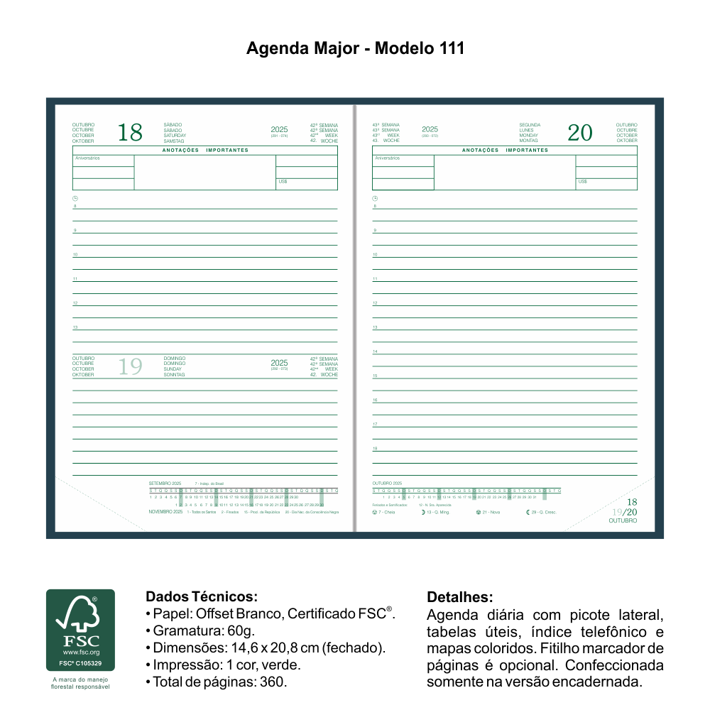 Agenda diária com picote lateral, tabelas úteis, índice telefônico e mapas coloridos. Fitilho marcador de páginas é opcional. Confeccionada somente na versão encadernada.