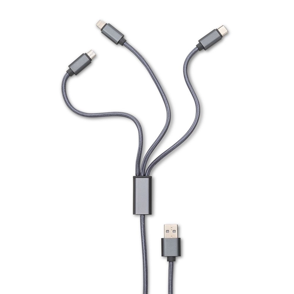 Cabo de dados 3 em 1 com revestimento em nylon, possui as entradas: USB Type-C (versão recente de Android), Lightning (Iphone) e V8 (Android).