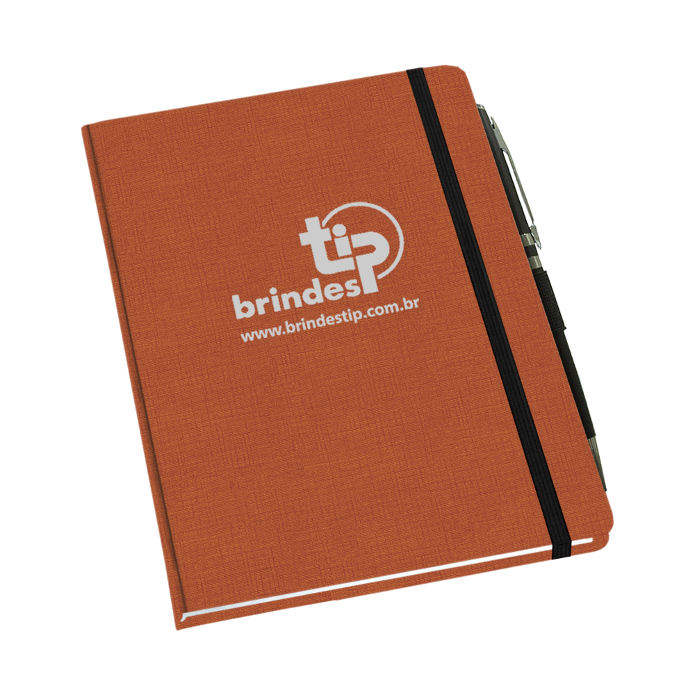 Caderno TA - Taipé. Material sintético com leve textura de pelica, fecho elástico, cantos redondos, suporte para caneta com caneta inclusa e acabamento encadernado.