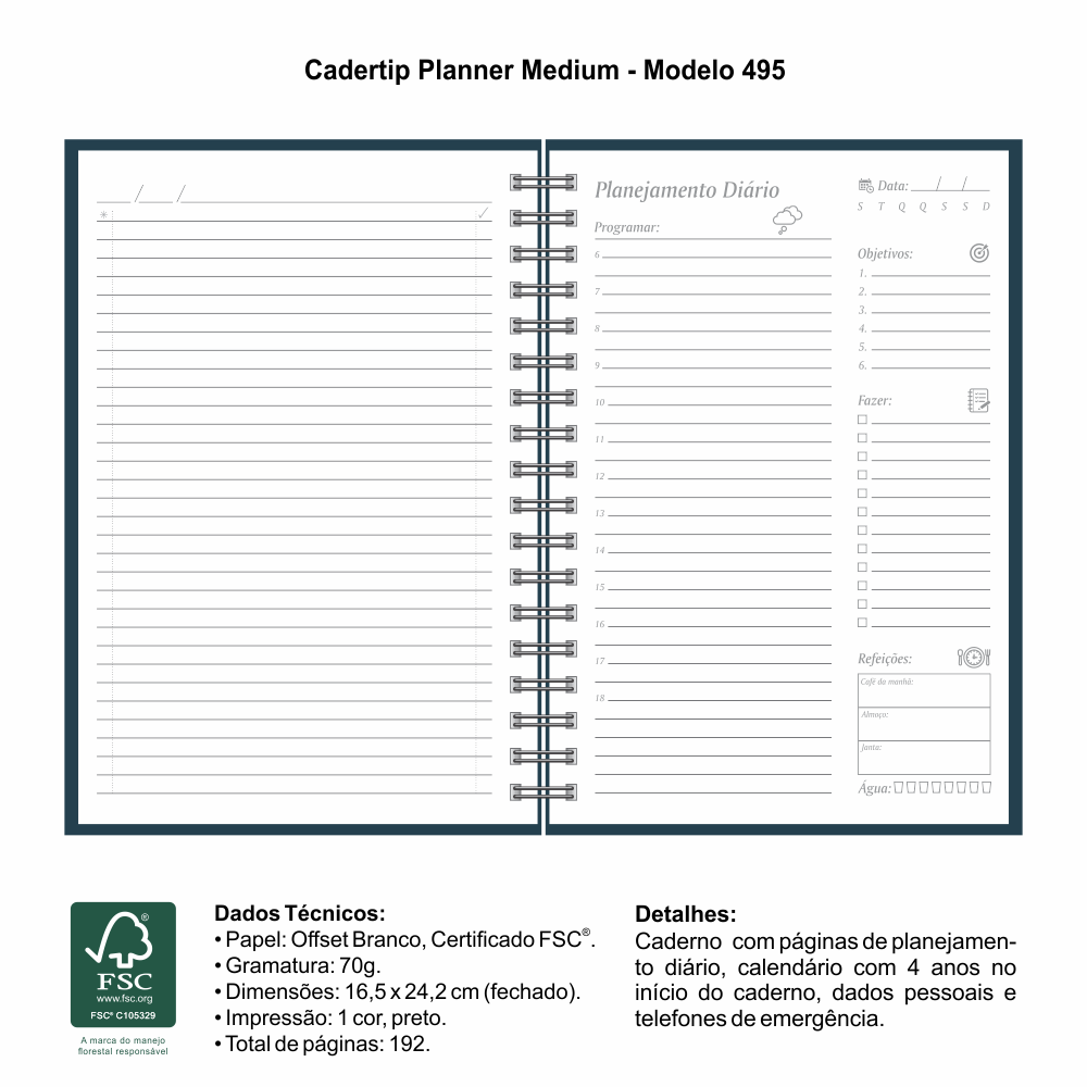 Caderno com páginas de planejamento diário, calendário com 4 anos no início do caderno, dados pessoais e telefones de emergência.
