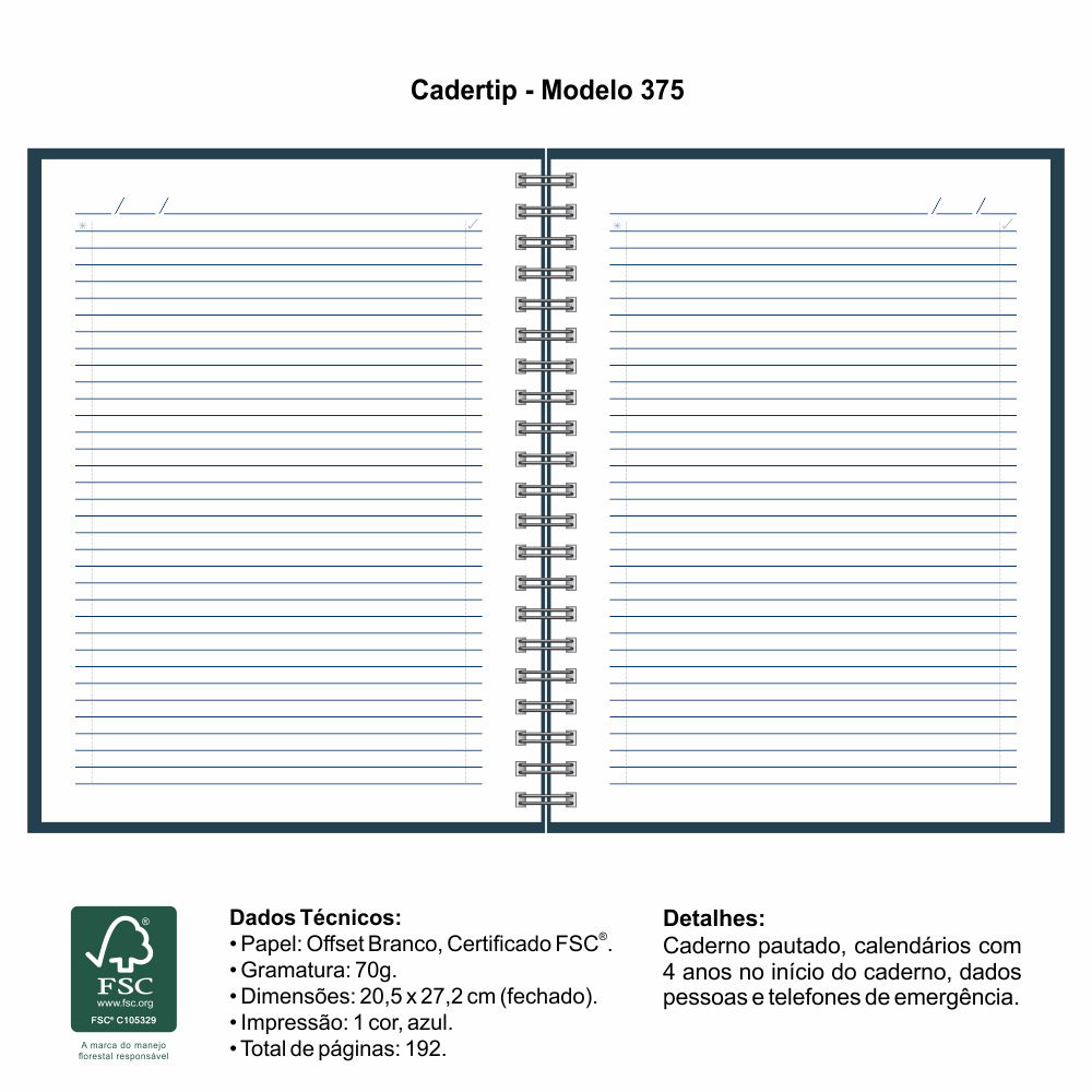 Caderno pautado, calendários com 4 anos no início do caderno, dados pessoas e telefones de emergência.