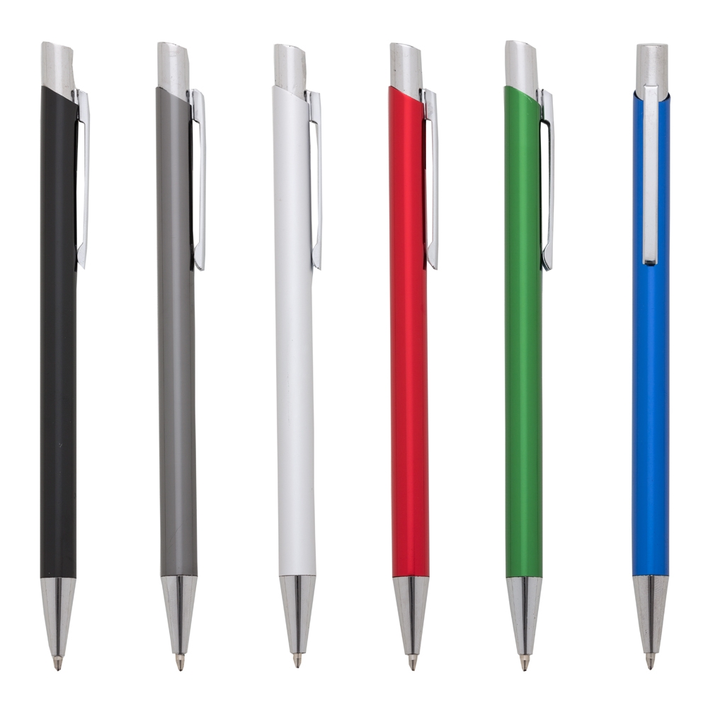 Caneta de metal fina inteira colorida com detalhes prata. Clip metal, aciona por clique.