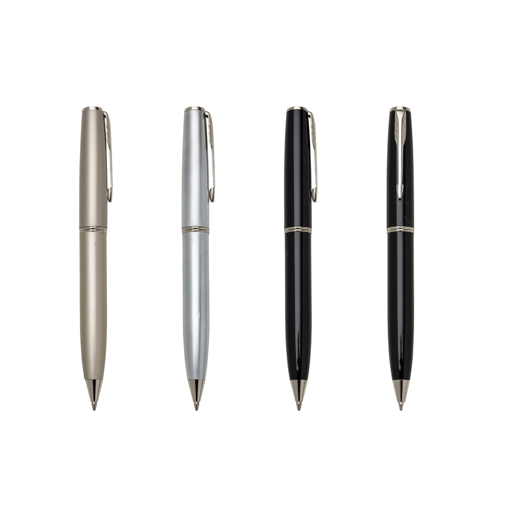 Caneta metal inteira colorida com detalhes prata. Clip metal com “ponta” e dois anéis centrais prata. Aciona por giro. OBS.: PEDIDO APENAS MÚLTIPLO DE 15 PEÇAS!