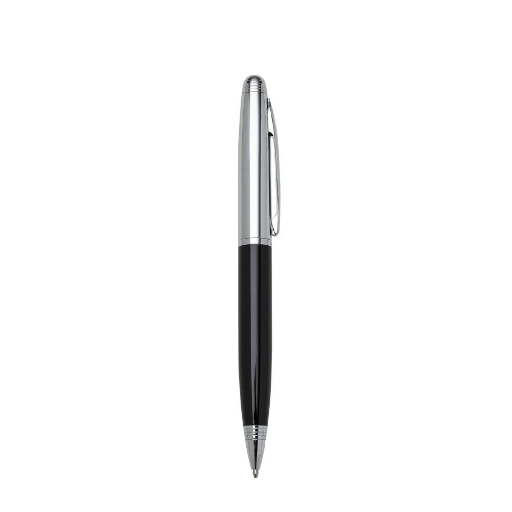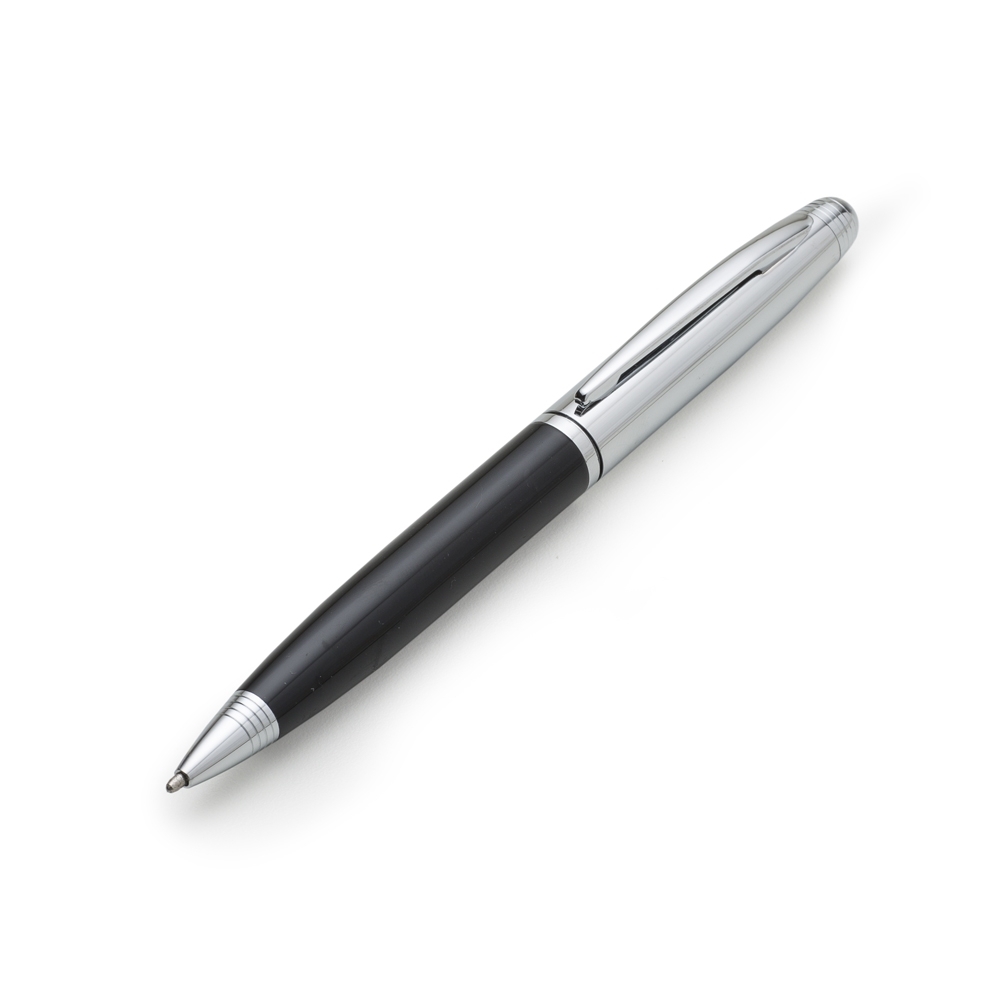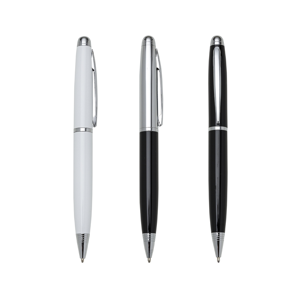 Caneta metal inteira colorida com detalhes prata. Clip metal com quatro anéis em relevo na “ponta”, anel prata central e quatro anéis em relevo na ponteira. Aciona por giro.