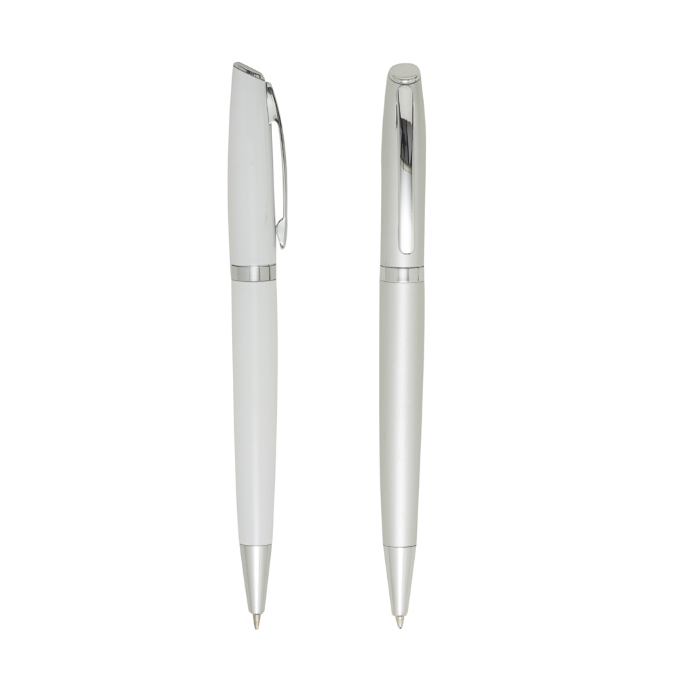 Caneta metal inteira colorida e detalhes em prata. Clip metal, possui parte superior e anel central em prata. Aciona por giro.