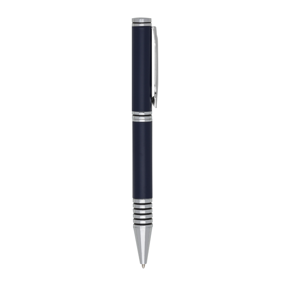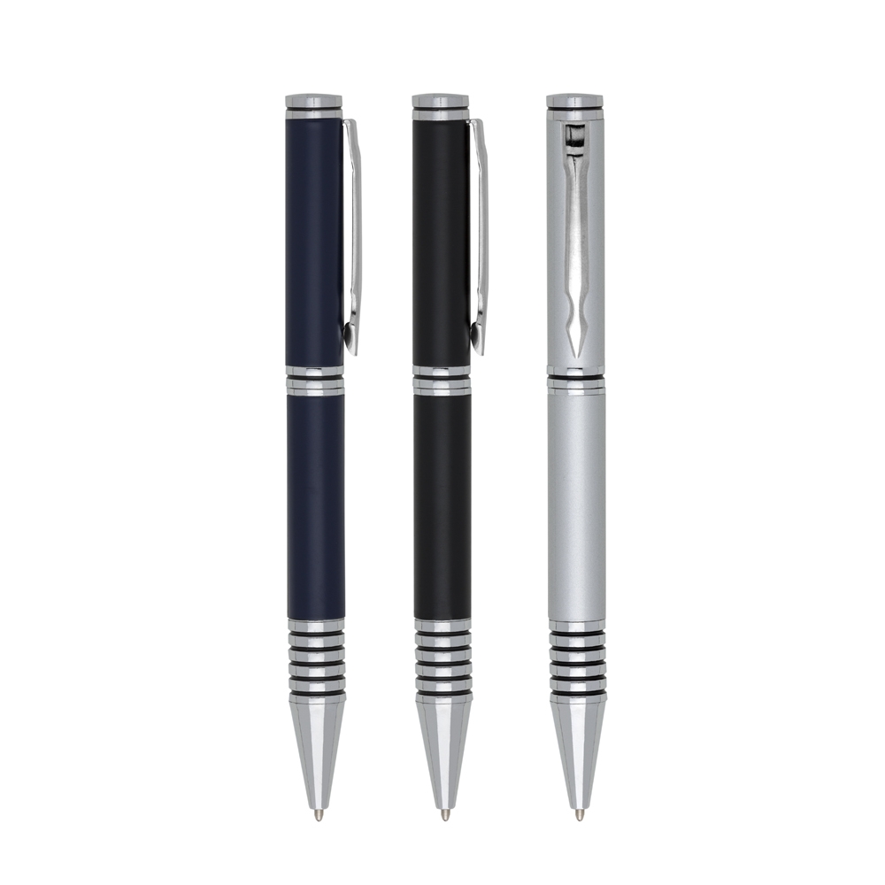 Caneta metal inteira colorida com detalhes prata. Clip metal, possui anel preto em relevo na parte superior e no centro. Seis anéis prata na parte inferior com um detalhe preto. Aciona por giro.