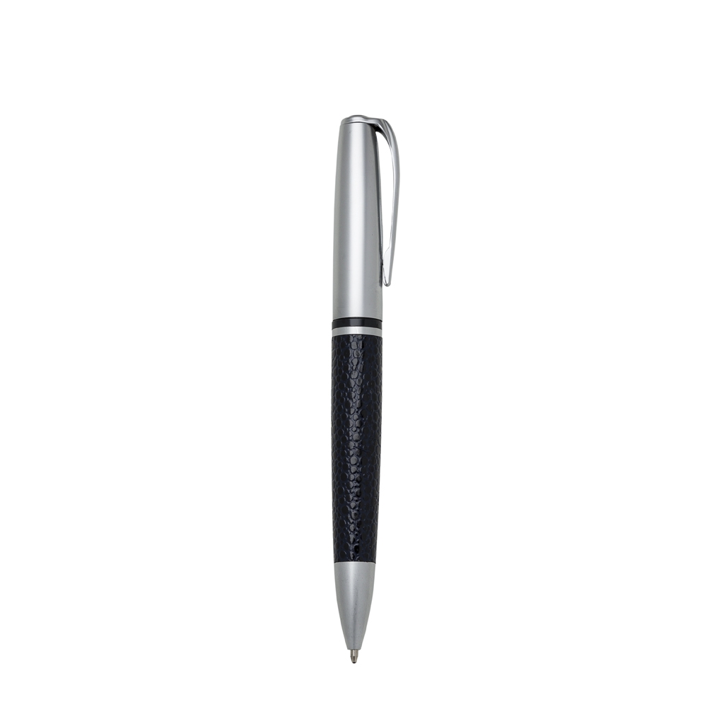 Caneta metal prata com detalhe em couro. Clip metal com a parte superior colorida e anel central preto. Possui as versões fosca e brilhante, aciona por giro.