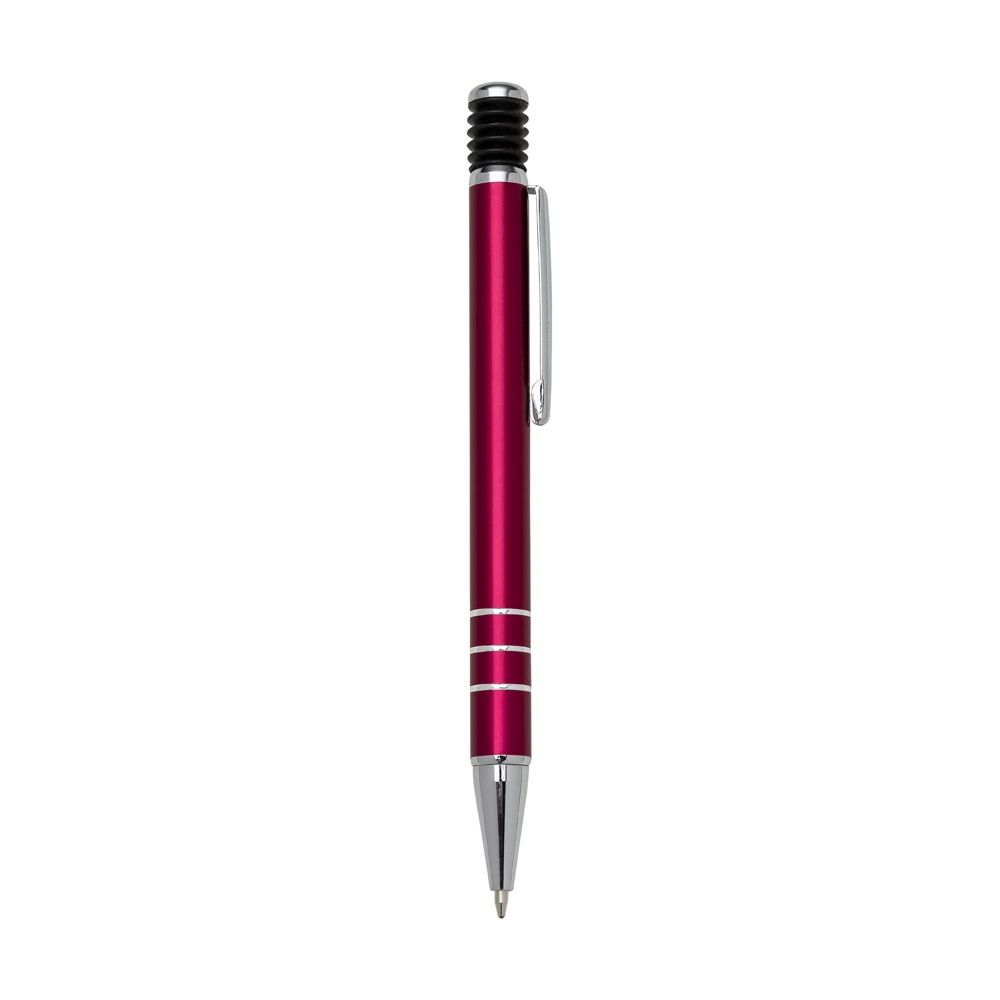 Caneta metal inteira colorida com detalhes prata. Clip metal e mola/sanfona preta no acionador, possui três anéis prata na parte inferior. Aciona por clique.