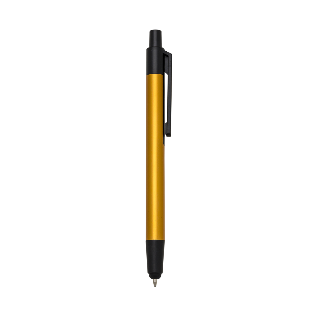 Caneta touch metal inteira colorida com detalhes preto. Clip plástico, possui touch e caneta esferográfica. Aciona por clique, esferográfica sai por dentro do touch. OBS.: PEDIDO APENAS MÚLTIPLO DE 50 PEÇAS!