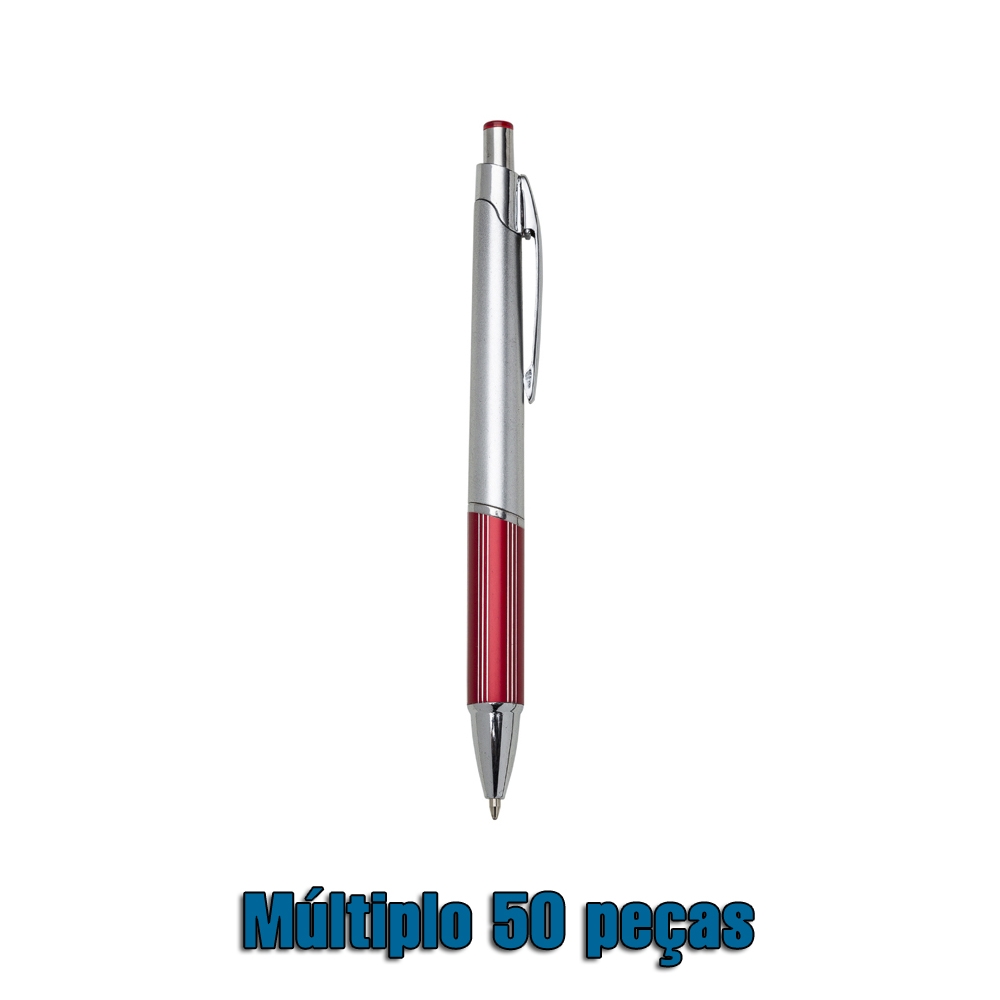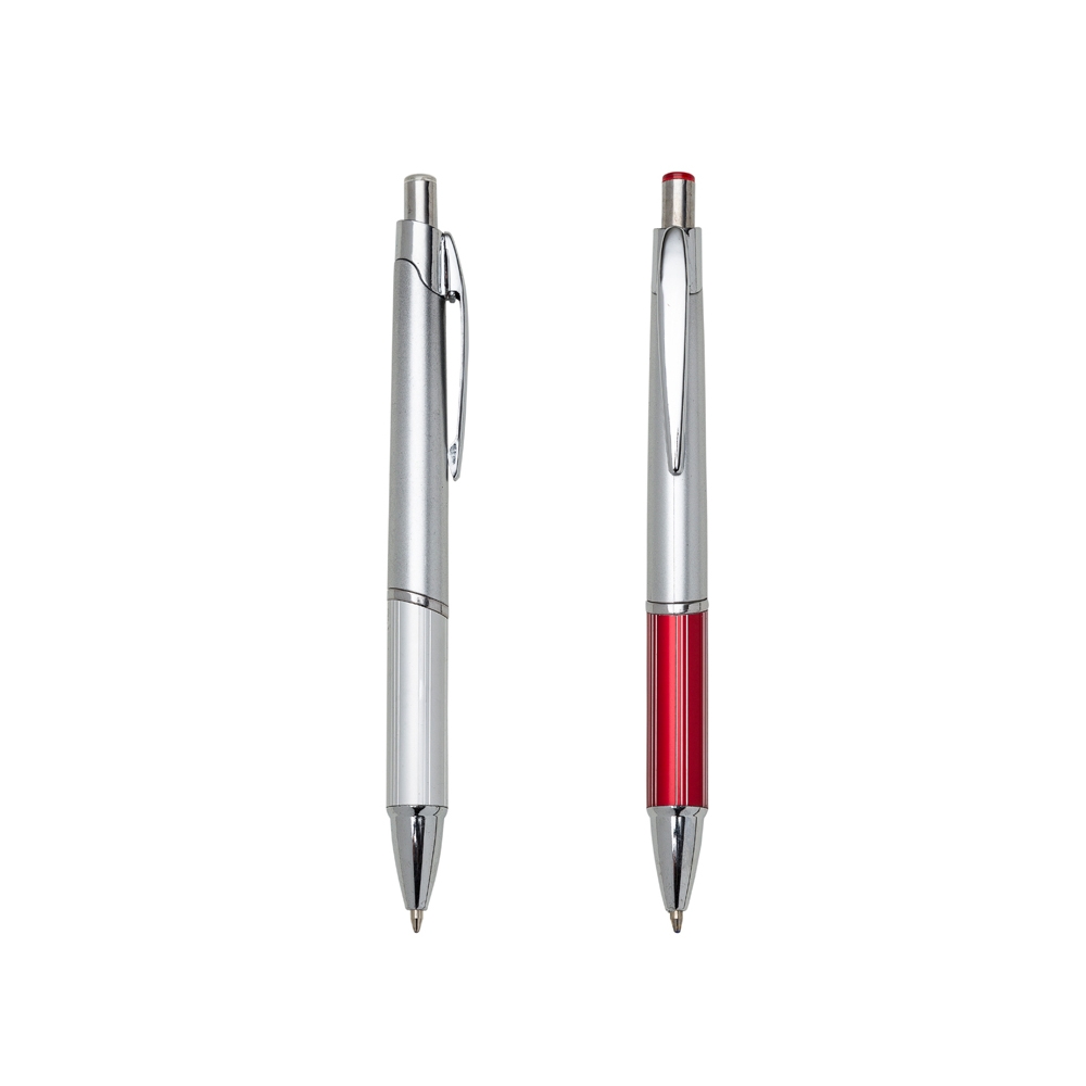 Caneta plástica prata com detalhes coloridos. Clip metal e acionador colorido, possui anel na parte inferior detalhe plástico colorido com seis conjuntos de linha sendo três em cada. Aciona por clique.