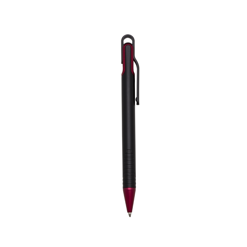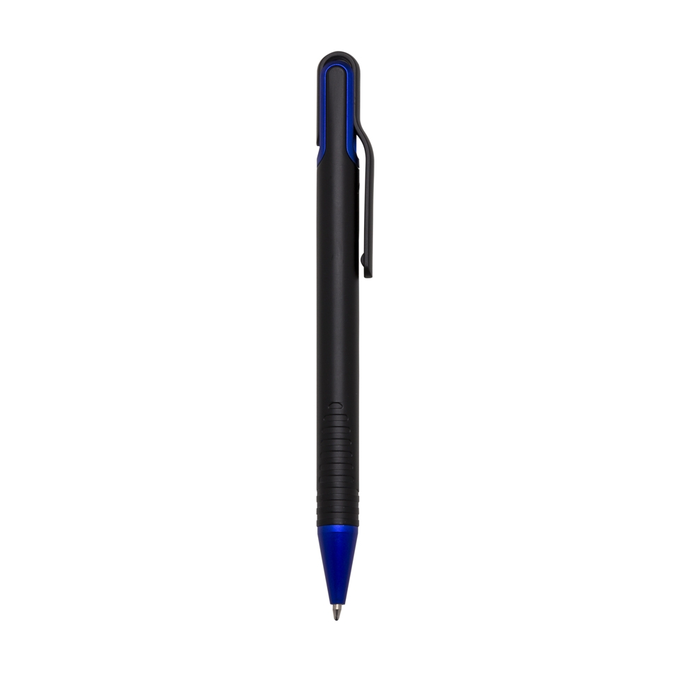 Caneta plástica inteira preta com laterais do acionador colorido. Detalhes em relevo na parte inferior. Aciona por giro.