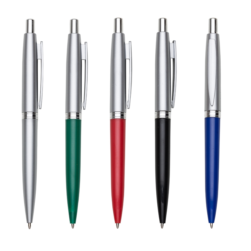Caneta plástica prata com detalhe colorido. Clip plástico, possui anel central com detalhes em relevo. Aciona por clique.