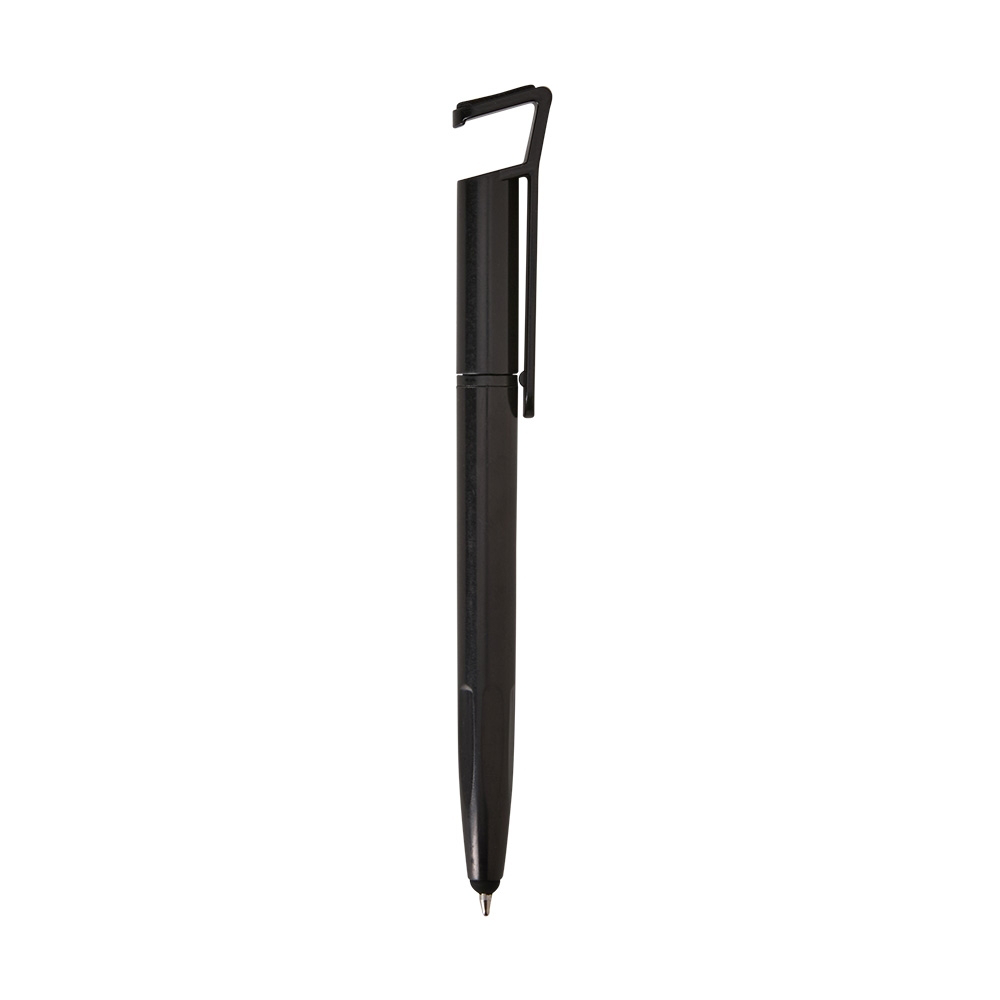 Caneta plástica com suporte para celular, ponteira touch screen e limpador de tela. Carga esferográfica azul 1.0 mm e acionamento por rotação.