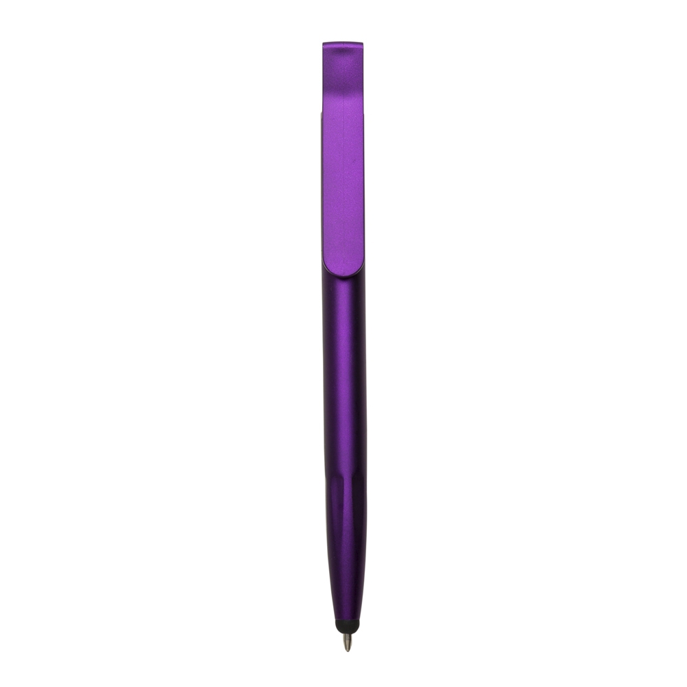 Caneta plástica touch com suporte para celular, caneta inteira colorida com detalhes preto. Clip plástico aberto utilizado como suporte para o celular e parte superior com limpador de tela, possui anel preto abaixo do clip e parte inferior com detalhes em relevo. Aciona por giro .