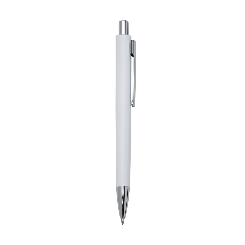 Caneta semimetal inteira colorida com clip metal, acionador e ponteira prata. Aciona por clique.