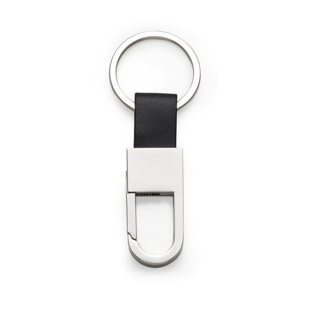 Chaveiro metal mosquetão(sem trava) com alça de couro sintético. Possui chapa frontal quadrada em inox e verso brilhante.