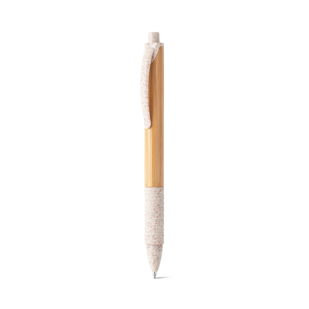 Esferográfica em bambu com clipe antideslizante e elementos coloridos em fibra de trigo e ABS. Escrita a azul. ø11 x 142 mm