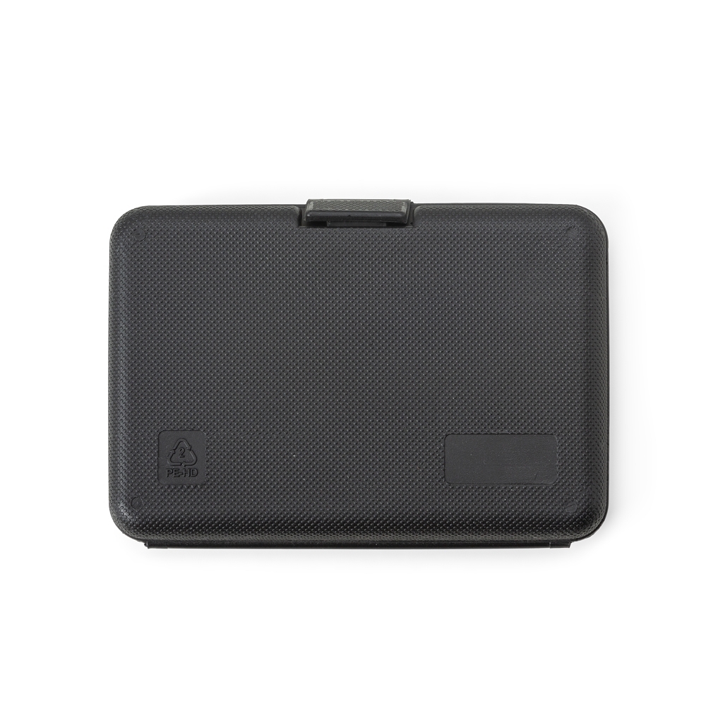 Kit ferramenta 11 peças em estojo plástico. Maleta plástica com detalhe retangular no centro frontal e verso com o detalhe na lateral inferior, possui texturização no estojo e uma trava superior. Acompanha: conjunto de 5 chaves Allen, fita métrica de 1 metro, chave teste, estilete, chave Philips, chave de fenda e alicate.